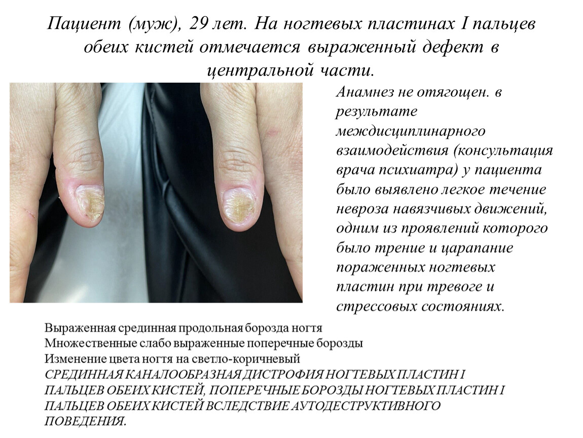 Анамнез не отягощен. в результате междисциплинарного взаимодействия (консультация врача психиатра) у пациента было выявлено легкое течение невроза навязчивых движений, одним из проявлений которого было трение и царапание пораженных ногтевых пластин при тревоге и стрессовых состояниях.