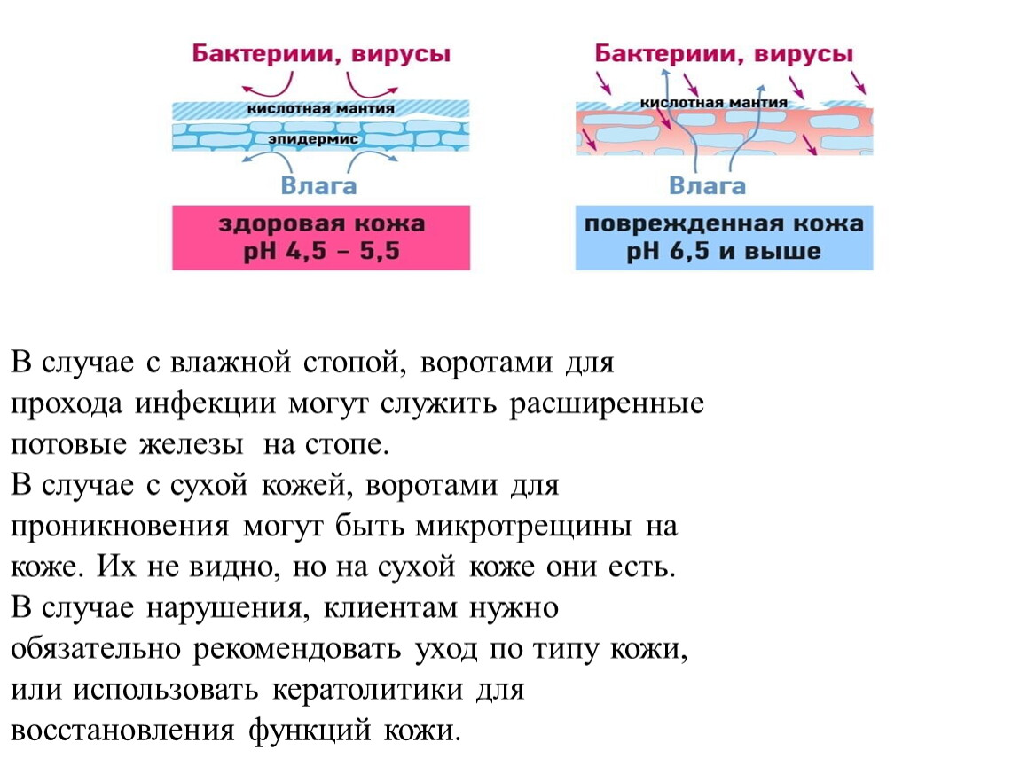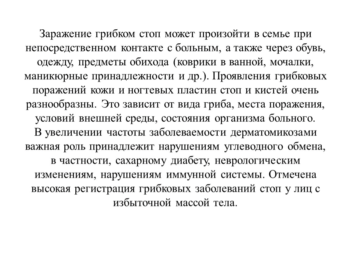 Заражение грибком стоп может произойти в семье при непосредственном контакте с больным, а также через обувь, одежду, предметы обихода (коврики в ванной, мочалки, маникюрные принадлежности и др.). Проявления грибковых поражений кожи и ногтевых пластин стоп и кистей очень разнообразны. Это зависит от вида гриба, места поражения, условий внешней среды, состояния организма больного.В увеличении частоты заболеваемости дерматомикозами важная роль принадлежит нарушениям углеводного обмена, в частности, сахарному диабету, неврологическим изменениям, нарушениям иммунной системы. Отмечена высокая регистрация грибковых заболеваний стоп у лиц с избыточной массой тела.