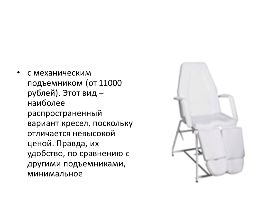 с механическим подъемником (от 11000 рублей). Этот вид – наиболее распространенный вариант кресел, поскольку отличается невысокой ценой. Правда, их удобство, по сравнению с другими подъемниками, минимальное