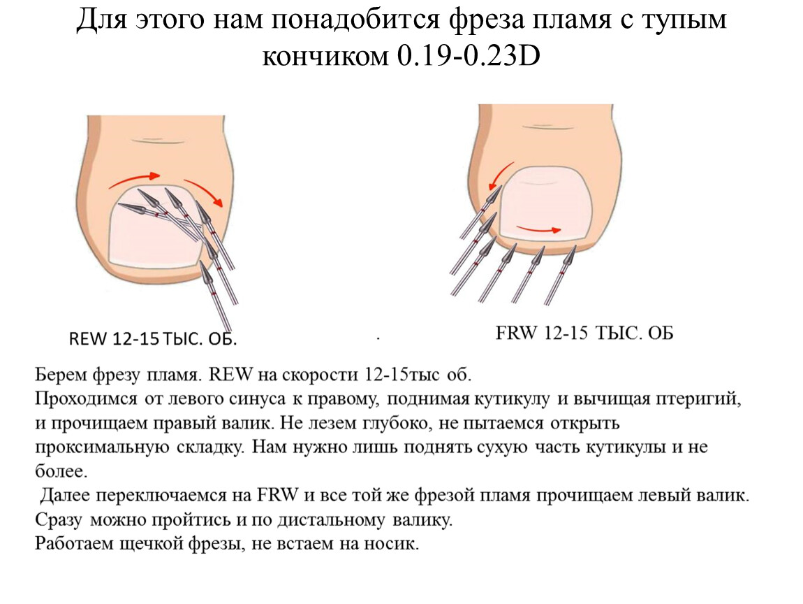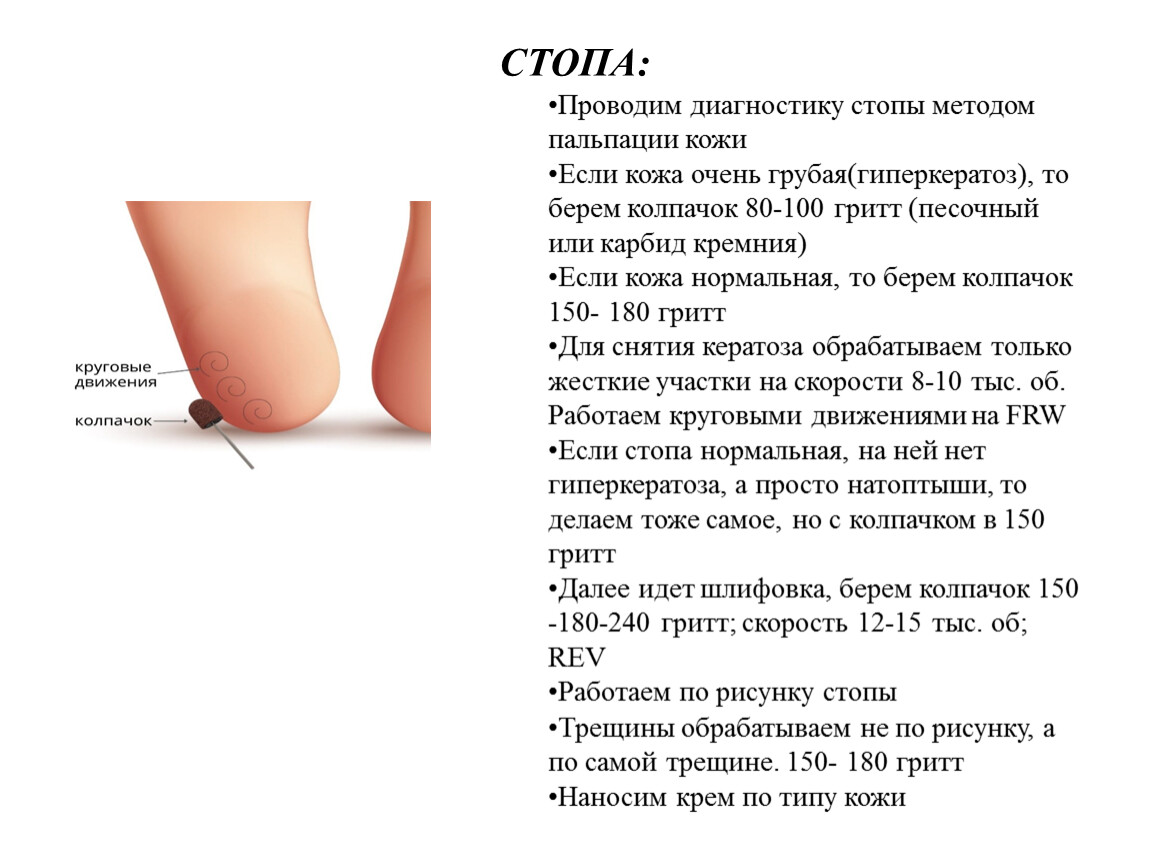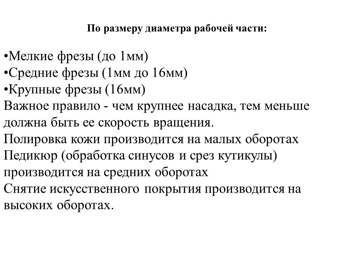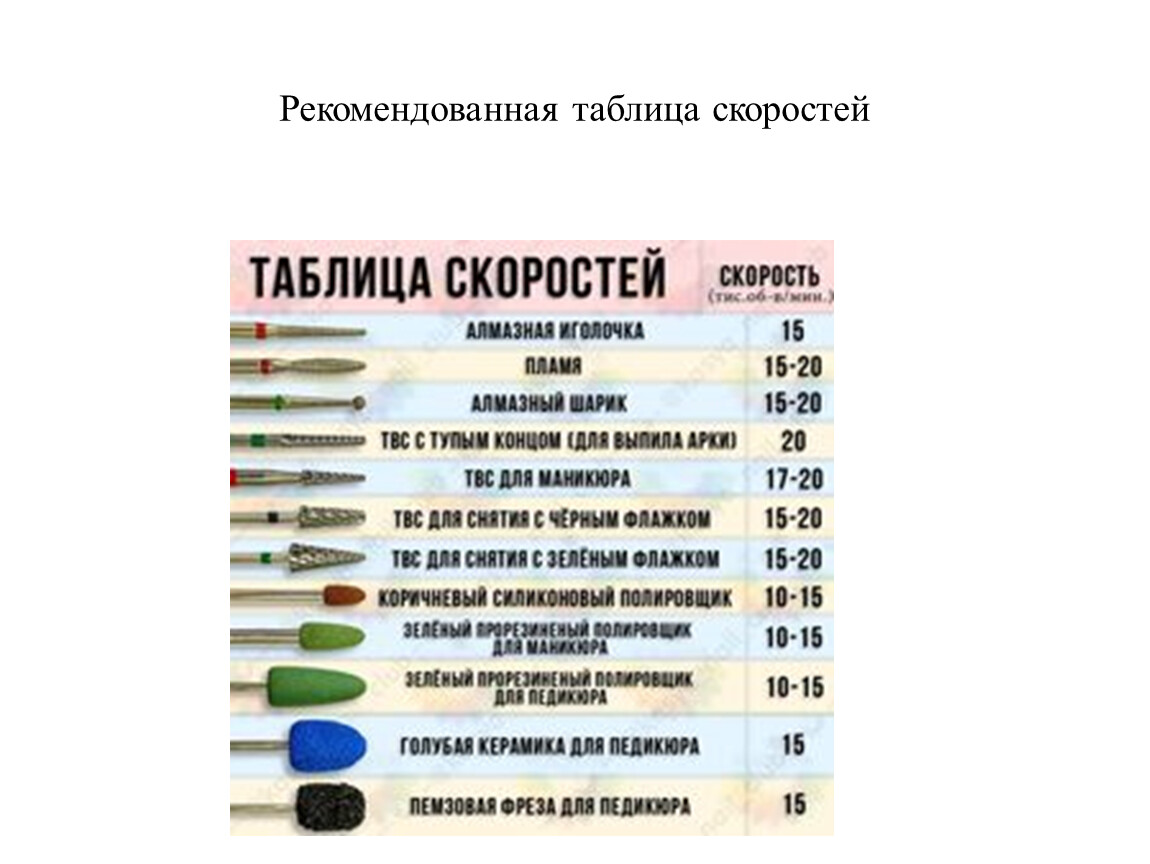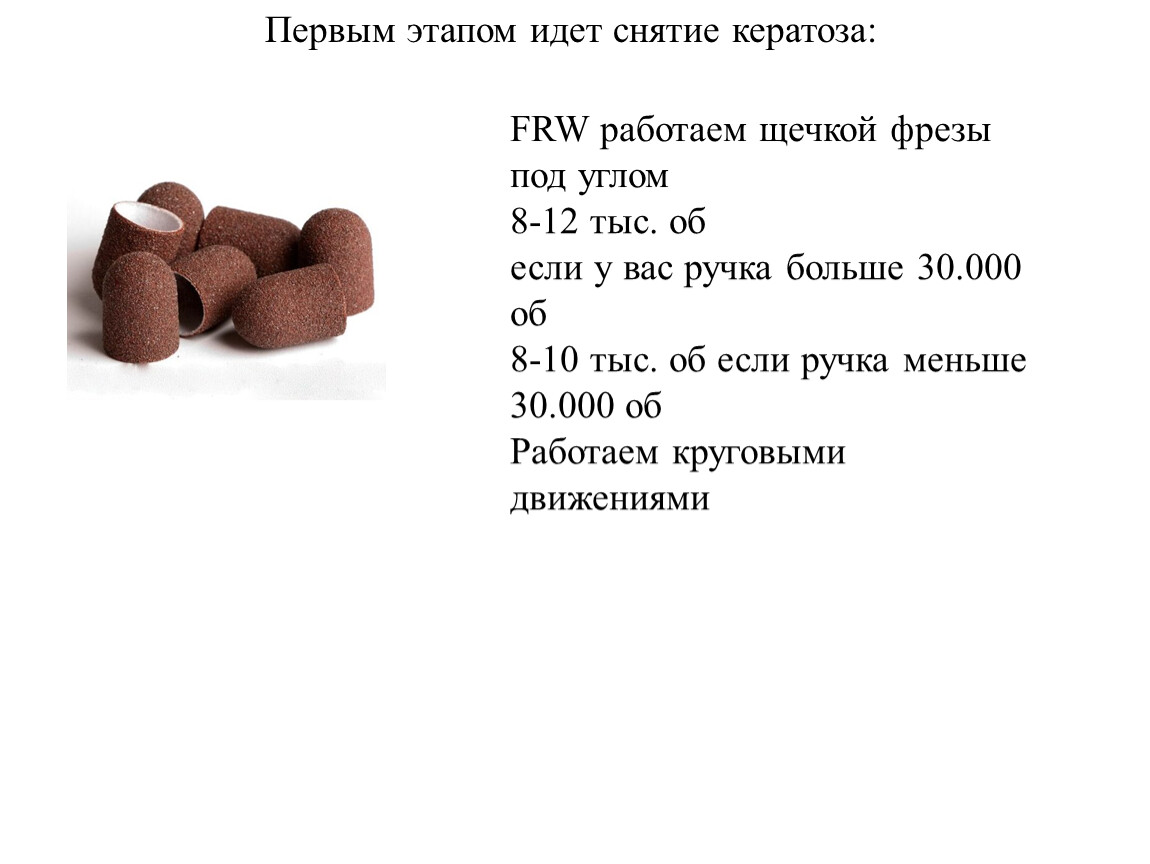 Важное правило - чем крупнее насадка, тем меньше должна быть ее скорость вращения.Полировка кожи производится на малых оборотахПедикюр (обработка синусов и срез кутикулы) производится на средних оборотахСнятие искусственного покрытия производится на высоких оборотах.