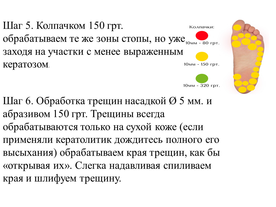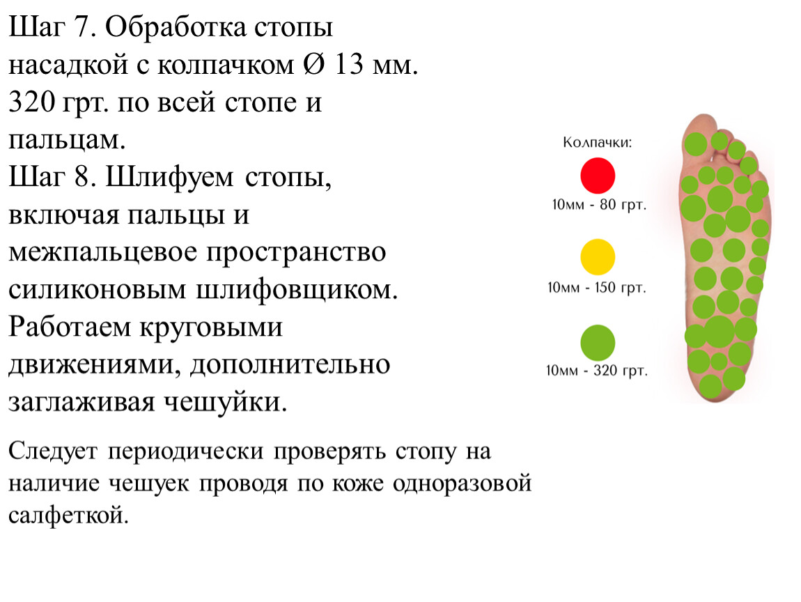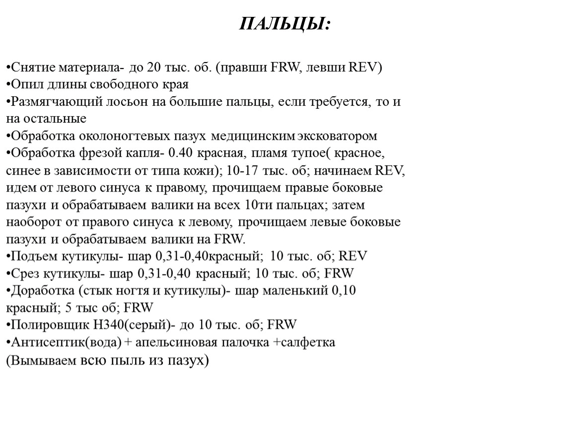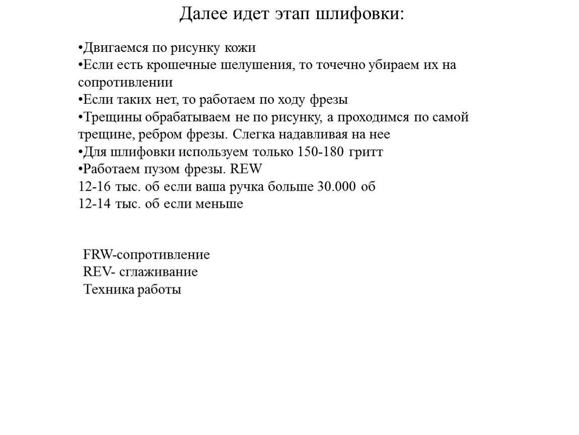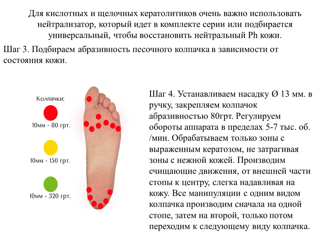 Важное правило - чем крупнее насадка, тем меньше должна быть ее скорость вращения.Полировка кожи производится на малых оборотахПедикюр (обработка синусов и срез кутикулы) производится на средних оборотахСнятие искусственного покрытия производится на высоких оборотах.