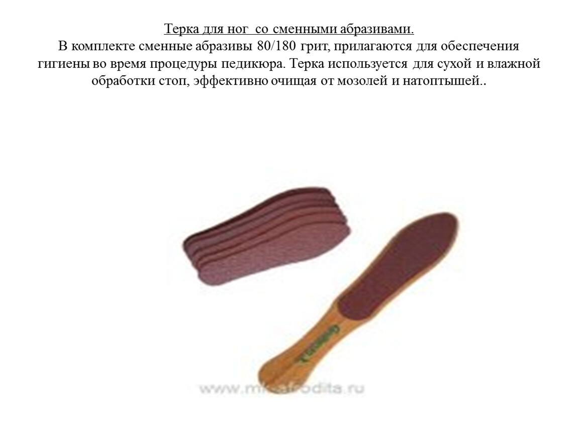 Терка для ног со сменными абразивами.В комплекте сменные абразивы 80/180 грит, прилагаются для обеспечения гигиены во время процедуры педикюра. Терка используется для сухой и влажной обработки стоп, эффективно очищая от мозолей и натоптышей..