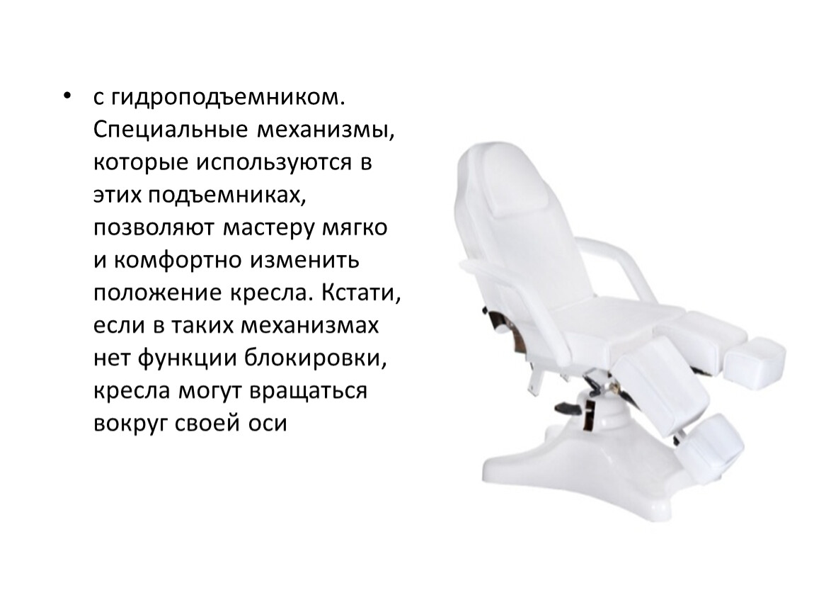 с гидроподъемником. Специальные механизмы, которые используются в этих подъемниках, позволяют мастеру мягко и комфортно изменить положение кресла. Кстати, если в таких механизмах нет функции блокировки, кресла могут вращаться вокруг своей оси