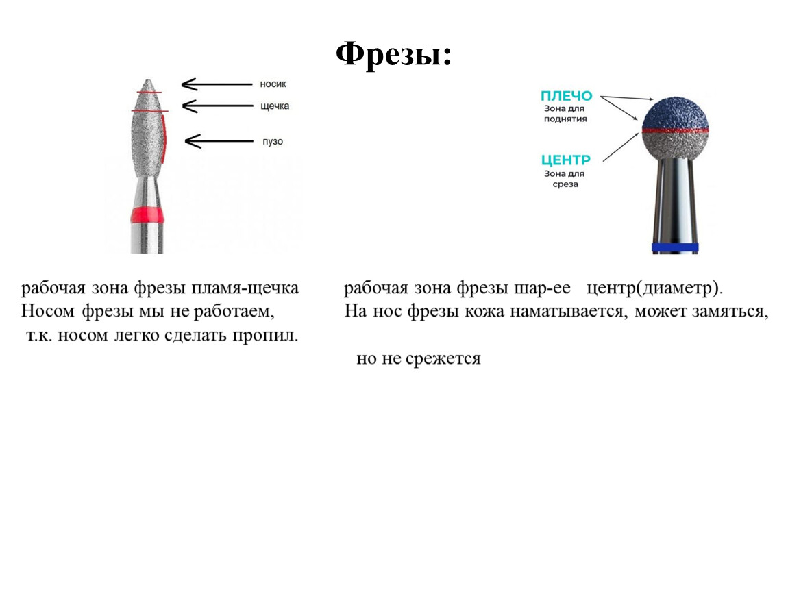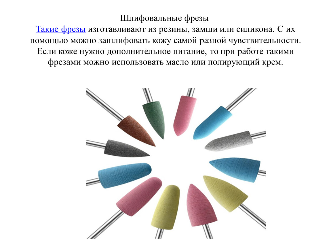Шлифовальные фрезы Такие фрезы изготавливают из резины, замши или силикона. С их помощью можно зашлифовать кожу самой разной чувствительности. Если коже нужно дополнительное питание, то при работе такими фрезами можно использовать масло или полирующий крем.