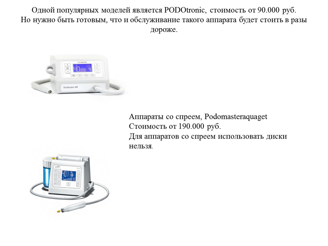Одной популярных моделей является PODOtronic, стоимость от 90.000 руб.Но нужно быть готовым, что и обслуживание такого аппарата будет стоить в разы дороже.