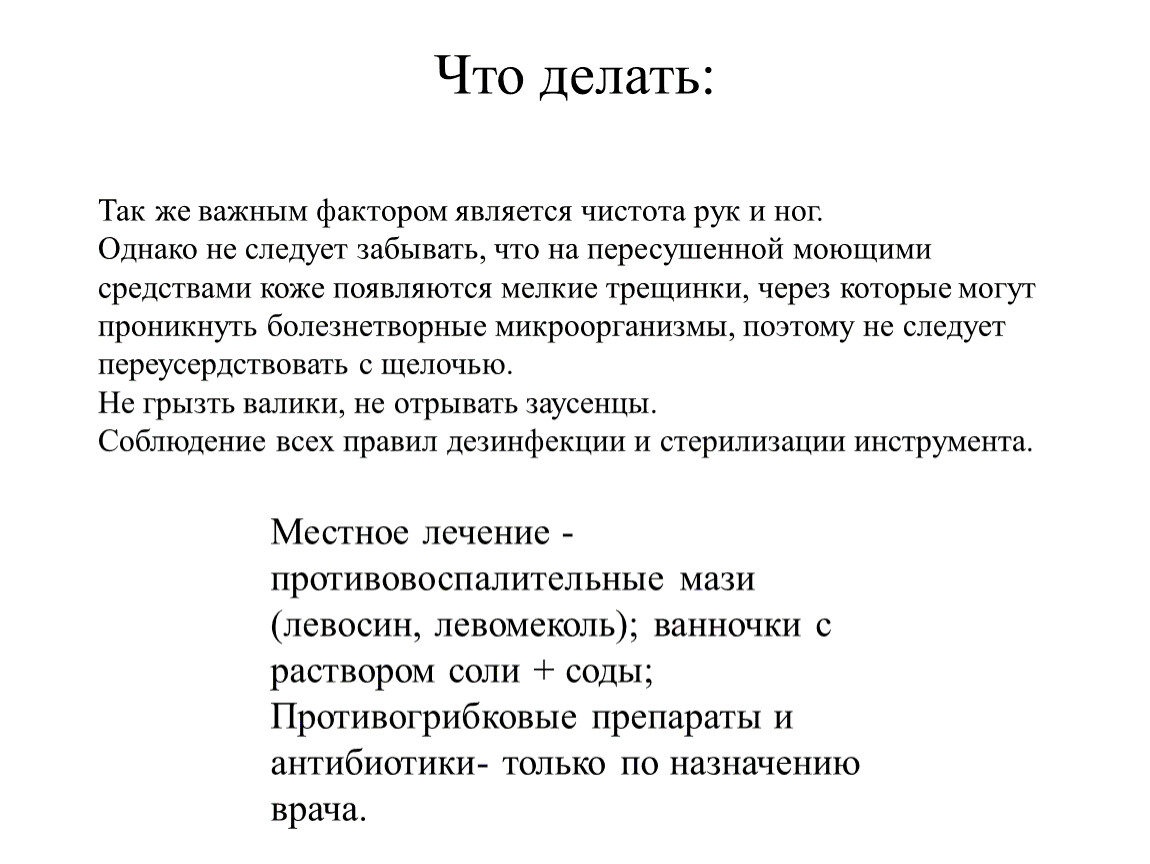 Местное лечение - противовоспалительные мази (левосин, левомеколь); ванночки с раствором соли + соды;