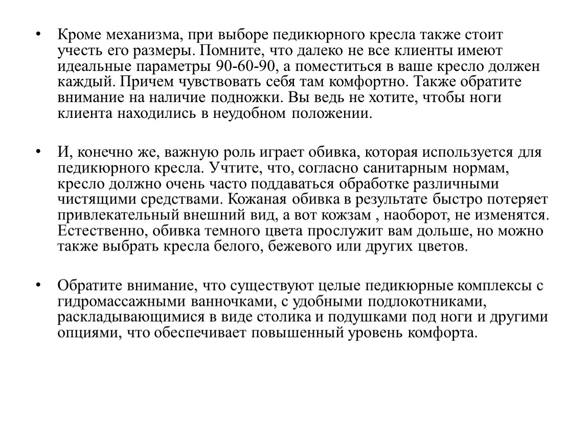 При выборе педикюрного кресла, необходимо, обратить внимание на следующие параметры: