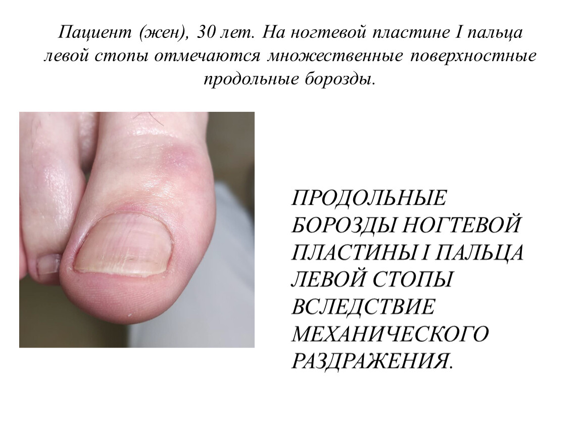 ПРОДОЛЬНЫЕ БОРОЗДЫ НОГТЕВОЙ ПЛАСТИНЫ I ПАЛЬЦА ЛЕВОЙ СТОПЫ ВСЛЕДСТВИЕ МЕХАНИЧЕСКОГО РАЗДРАЖЕНИЯ.