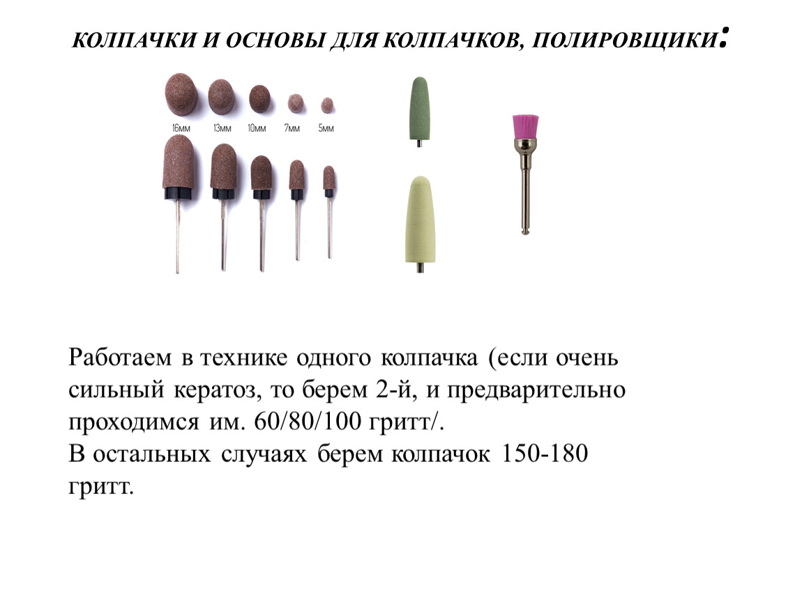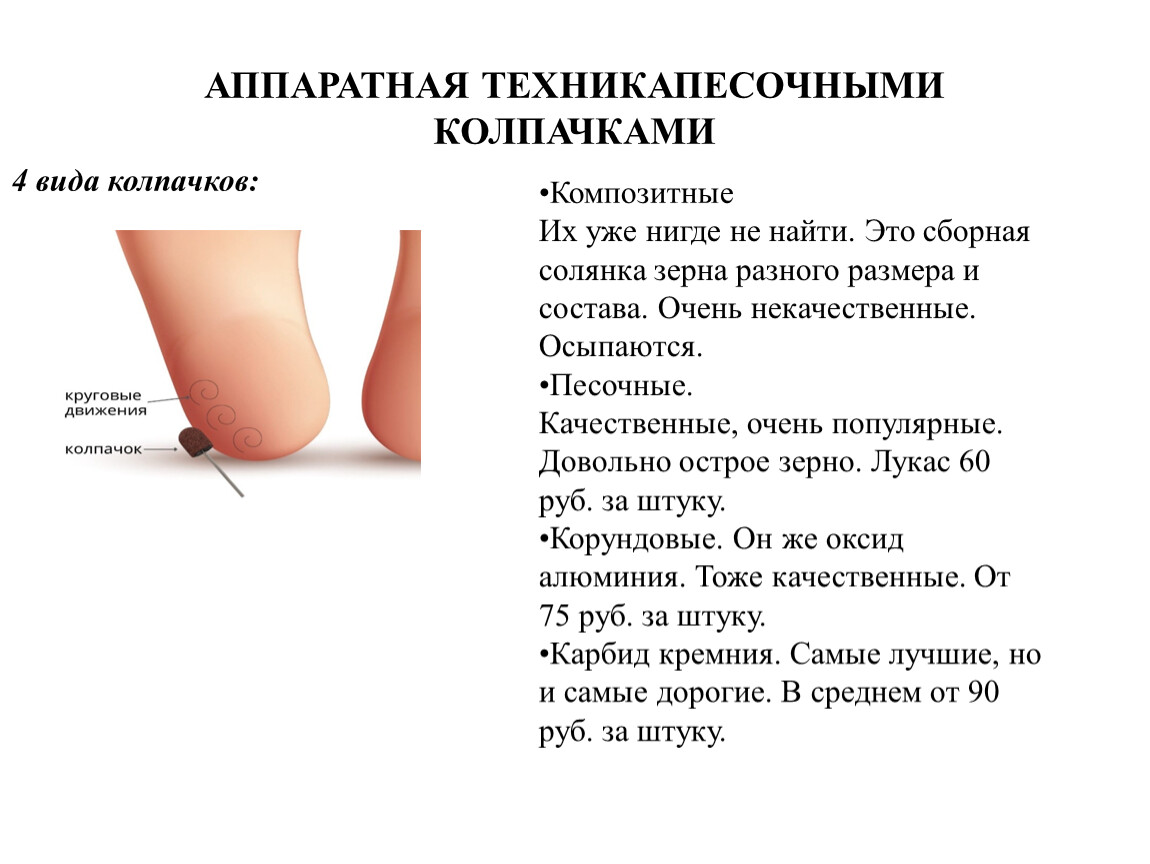 Кремниево-карбидные, песочные колпачкиКолпачки используются в педикюре для обработки огрубевшей кожи, натоптышей. Их изготавливают из картона, на который наносят абразивное напыление. Для работы колпачки надевают на специальную резиновую основу. После работы основа проходит стерилизацию, а колпачок выбрасывается (он является одноразовым).