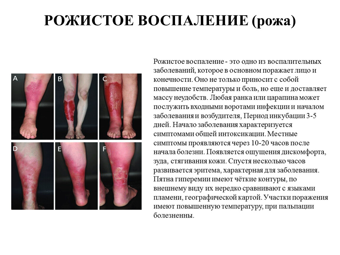 Рожистое воспаление - это одно из воспалительных заболеваний, которое в основном поражает лицо и конечности. Оно не только приносит с собой повышение температуры и боль, но еще и доставляет массу неудобств. Любая ранка или царапина может послужить входными воротами инфекции и началом заболевания и возбудителя, Период инкубации 3-5 дней. Начало заболевания характеризуется симптомами общей интоксикации. Местные симптомы проявляются через 10-20 часов после начала болезни. Появляется ощущения дискомфорта, зуда, стягивания кожи. Спустя несколько часов развивается эритема, характерная для заболевания. Пятна гиперемии имеют чёткие контуры, по внешнему виду их нередко сравнивают с языками пламени, географической картой. Участки поражения имеют повышенную температуру, при пальпации болезненны.