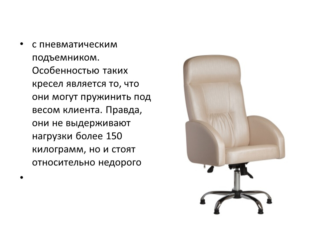 с пневматическим подъемником. Особенностью таких кресел является то, что они могут пружинить под весом клиента. Правда, они не выдерживают нагрузки более 150 килограмм, но и стоят относительно недорого