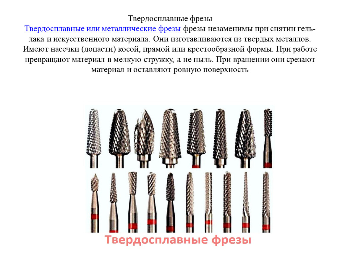 Твердосплавные фрезыТвердосплавные или металлические фрезы фрезы незаменимы при снятии гель-лака и искусственного материала. Они изготавливаются из твердых металлов. Имеют насечки (лопасти) косой, прямой или крестообразной формы. При работе превращают материал в мелкую стружку, а не пыль. При вращении они срезают материал и оставляют ровную поверхность