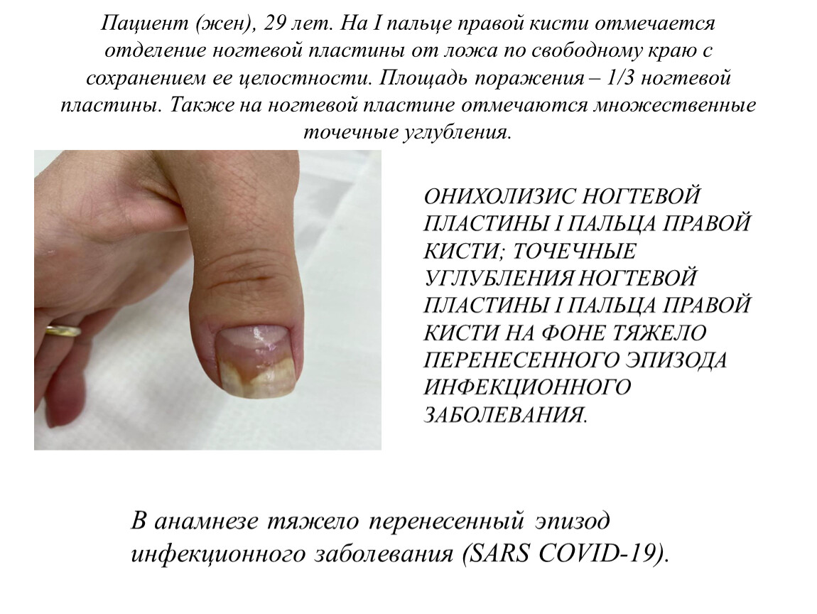 ОНИХОЛИЗИС НОГТЕВОЙ ПЛАСТИНЫ I ПАЛЬЦА ПРАВОЙ КИСТИ; ТОЧЕЧНЫЕ УГЛУБЛЕНИЯ НОГТЕВОЙ ПЛАСТИНЫ I ПАЛЬЦА ПРАВОЙ КИСТИ НА ФОНЕ ТЯЖЕЛО ПЕРЕНЕСЕННОГО ЭПИЗОДА ИНФЕКЦИОННОГО ЗАБОЛЕВАНИЯ.