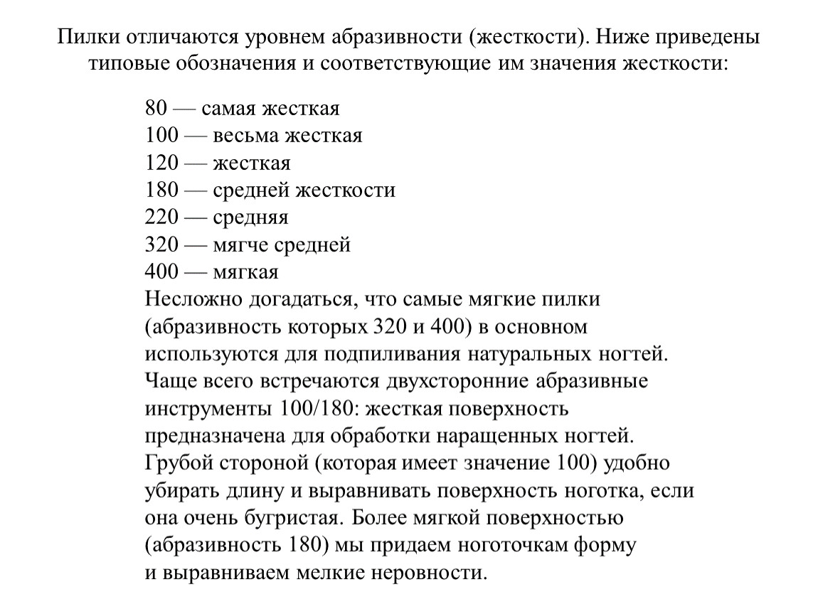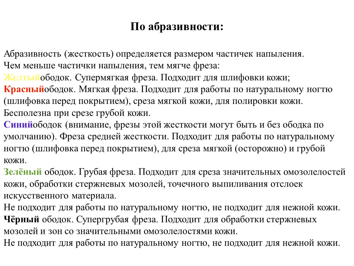 Синийободок (внимание, фрезы этой жесткости могут быть и без ободка по умолчанию). Фреза средней жесткости. Подходит для работы по натуральному ногтю (шлифовка перед покрытием), для среза мягкой (осторожно) и грубой кожи.Зелёный ободок. Грубая фреза. Подходит для среза значительных омозолелостей кожи, обработки стержневых мозолей, точечного выпиливания отслоек искусственного материала.Не подходит для работы по натуральному ногтю, не подходит для нежной кожи.Чёрный ободок. Супергрубая фреза. Подходит для обработки стержневых мозолей и зон со значительными омозолелостями кожи.Не подходит для работы по натуральному ногтю, не подходит для нежной кожи.