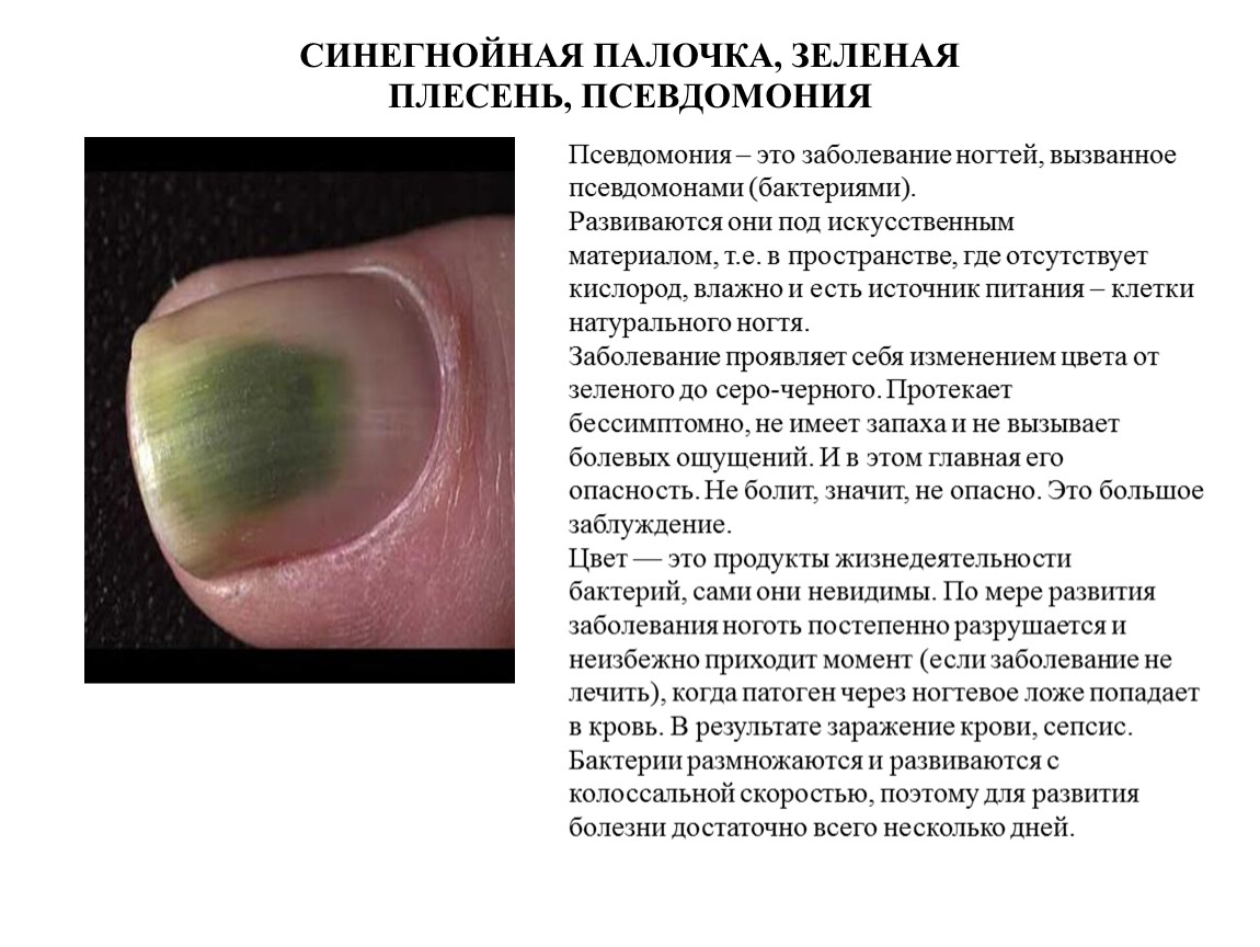 Цвет — это продукты жизнедеятельности бактерий, сами они невидимы. По мере развития заболевания ноготь постепенно разрушается и неизбежно приходит момент (если заболевание не лечить), когда патоген через ногтевое ложе попадает в кровь. В результате заражение крови, сепсис.