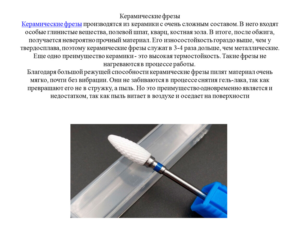 Керамические фрезыКерамические фрезы производятся из керамики с очень сложным составом. В него входят особые глинистые вещества, полевой шпат, кварц, костная зола. В итоге, после обжига, получается невероятно прочный материал. Его износостойкость гораздо выше, чем у твердосплава, поэтому керамические фрезы служат в 3-4 раза дольше, чем металлические. Еще одно преимущество керамики - это высокая термостойкость. Такие фрезы не нагреваются в процессе работы. Благодаря большой режущей способности керамические фрезы пилят материал очень мягко, почти без вибрации. Они не забиваются в процессе снятия гель-лака, так как превращают его не в стружку, а пыль. Но это преимущество одновременно является и недостатком, так как пыль витает в воздухе и оседает на поверхности