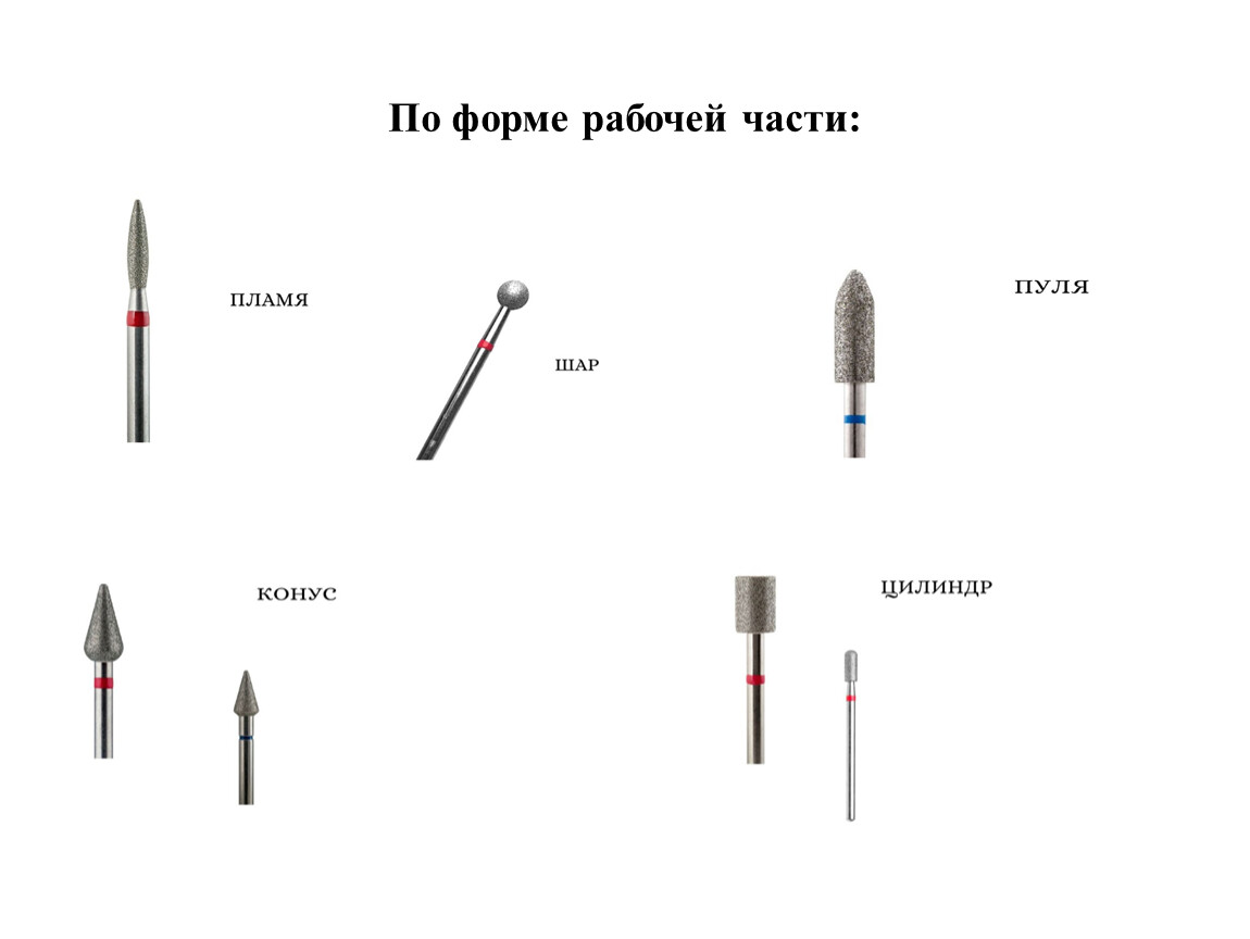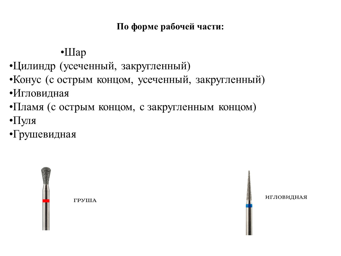 Фрезы разделяются на виды по материалу рабочей части, форме рабочей части, абразивности, размеру диаметра рабочей части.