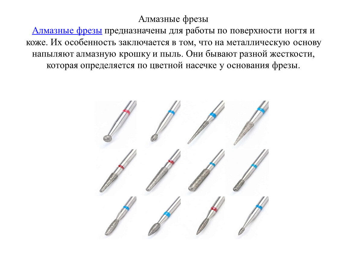 Алмазные фрезыАлмазные фрезы предназначены для работы по поверхности ногтя и коже. Их особенность заключается в том, что на металлическую основу напыляют алмазную крошку и пыль. Они бывают разной жесткости, которая определяется по цветной насечке у основания фрезы.