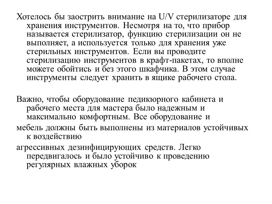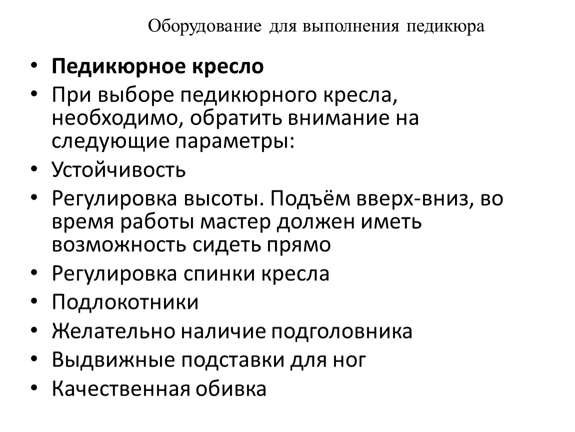 Важно, чтобы оборудование педикюрного кабинета и рабочего места для мастера было надежным и максимально комфортным. Все оборудование и