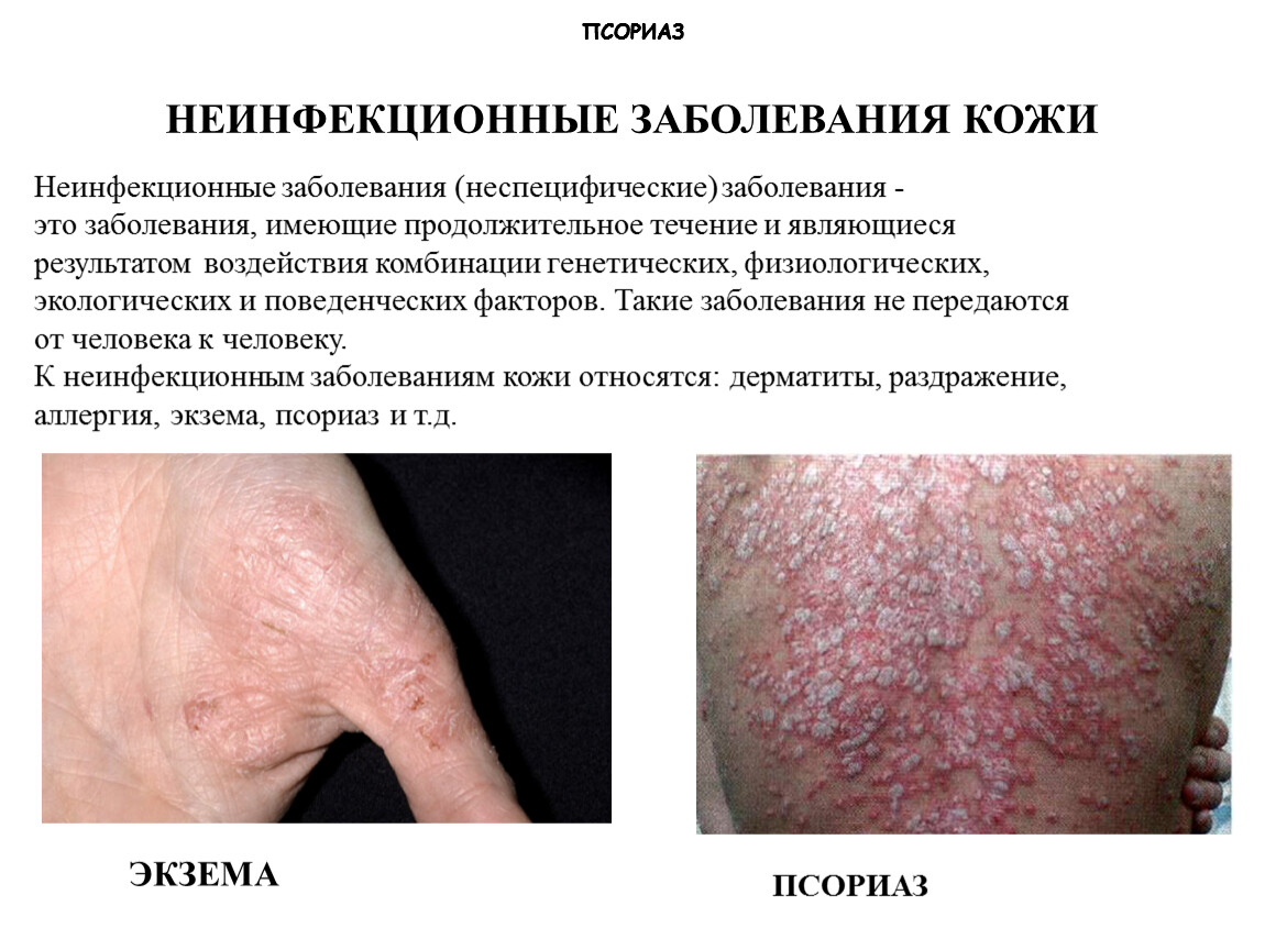 К неинфекционным заболеваниям кожи относятся: дерматиты, раздражение, аллергия, экзема, псориаз и т.д.