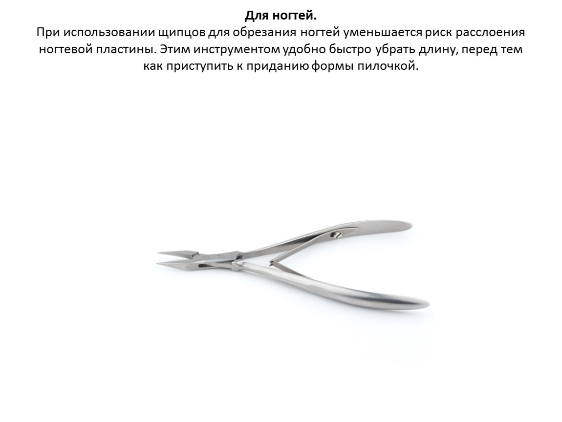 Для ногтей.При использовании щипцов для обрезания ногтей уменьшается риск расслоения ногтевой пластины. Этим инструментом удобно быстро убрать длину, перед тем как приступить к приданию формы пилочкой.
