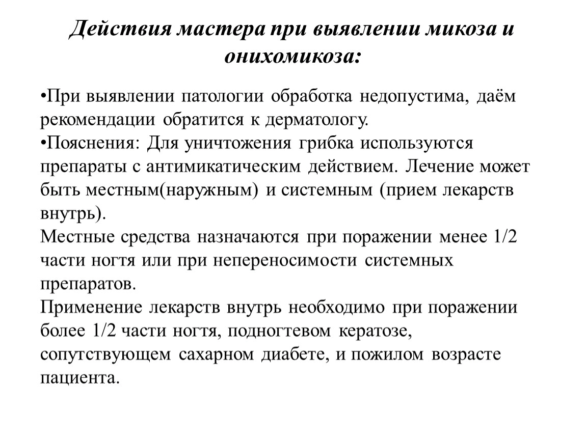 Действия мастера при выявлении микоза и онихомикоза: