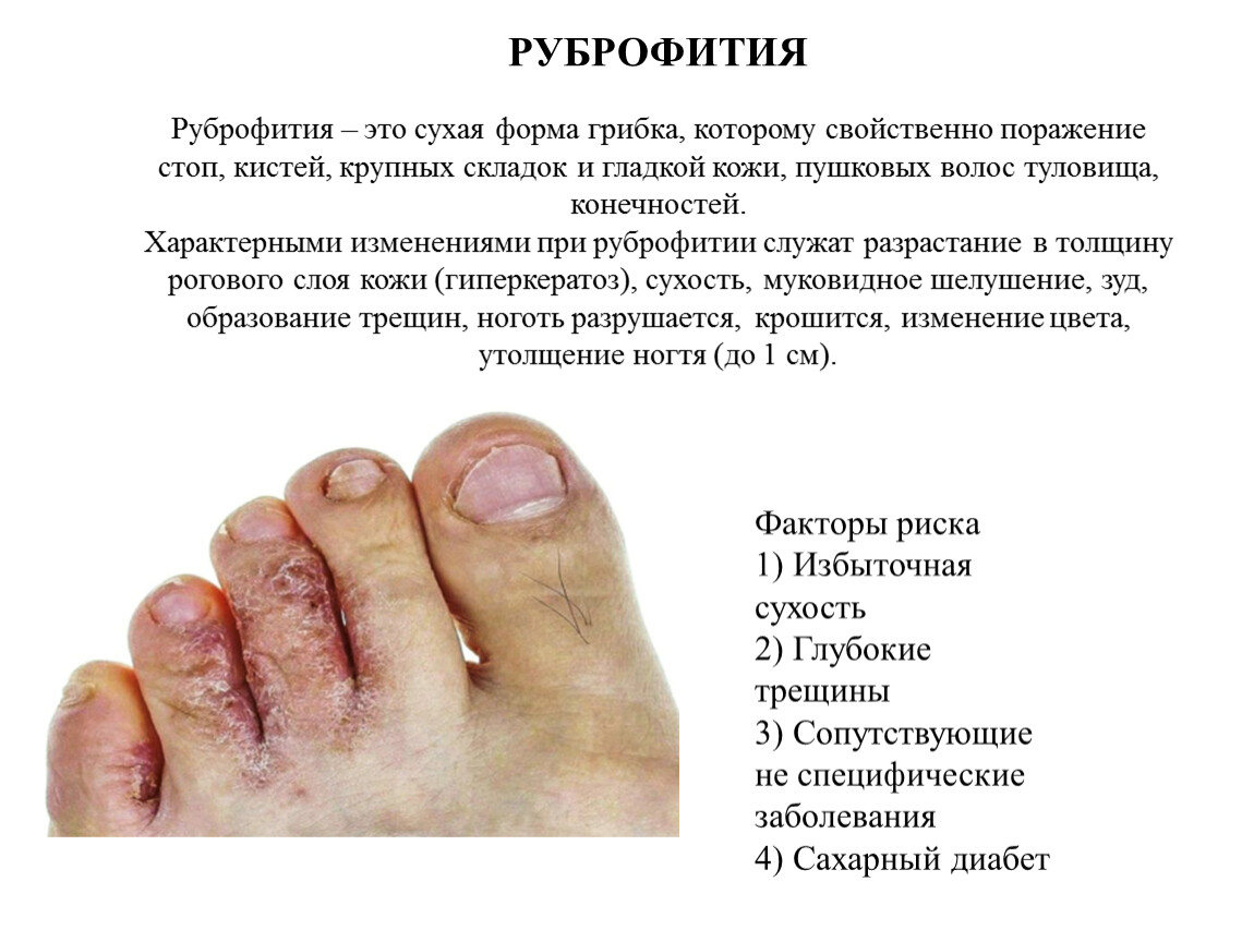 Руброфития Руброфития – это сухая форма грибка, которому свойственно поражение стоп, кистей, крупных складок и гладкой кожи, пушковых волос туловища, конечностей.Характерными изменениями при руброфитии служат разрастание в толщину рогового слоя кожи (гиперкератоз), сухость, муковидное шелушение, зуд, образование трещин, ноготь разрушается, крошится, изменение цвета, утолщение ногтя (до 1 см).
