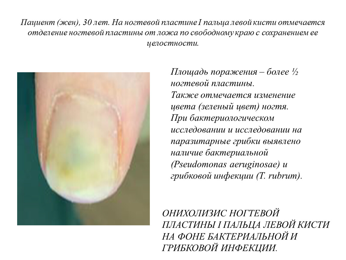 ОНИХОЛИЗИС НОГТЕВОЙ ПЛАСТИНЫ I ПАЛЬЦА ЛЕВОЙ КИСТИ НА ФОНЕ БАКТЕРИАЛЬНОЙ И ГРИБКОВОЙ ИНФЕКЦИИ.