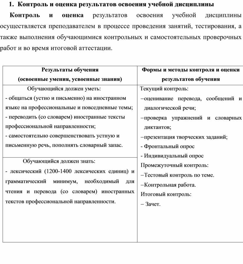Текущий контроль: - оценивание перевода, сообщений и диалогической речи; - проверка упражнений и словарных диктантов; - презентация творческих заданий; - Фронтальный опрос - Индивидуальный опрос Промежуточный контроль: - Тестовый контроль по теме. - Контрольная работа. Итоговый контроль: - Зачет.