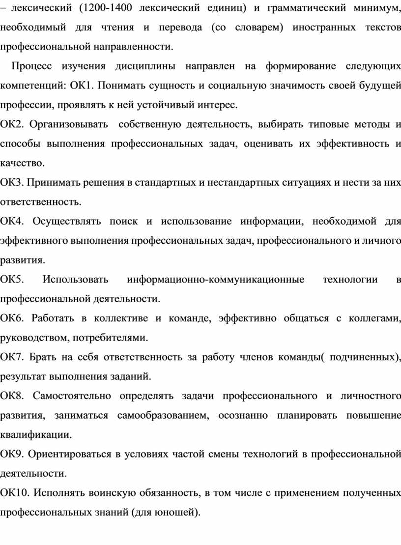 - лексический (1200-1400 лексический единиц) и грамматический минимум, необходимый для чтения и перевода (со словарем) иностранных текстов профессиональной направленности.
