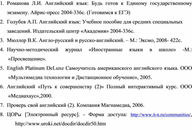 4. Романова Л.И. Английский язык: Будь готов к Единому государственному экзамену. Айрис-пресс 2004-336с. (Готовимся к ЕГЭ)