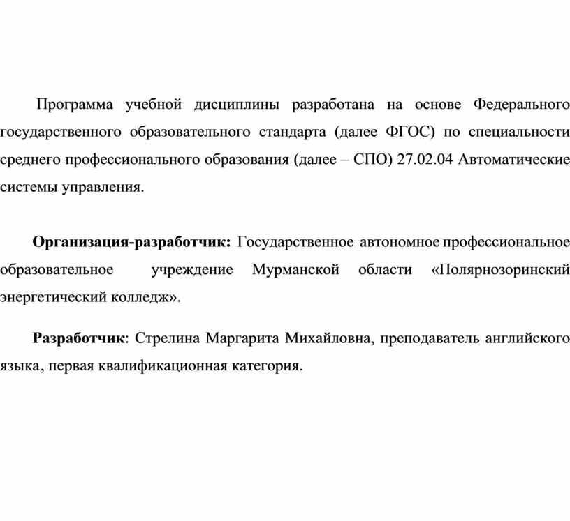Организация-разработчик: Государственное автономное профессиональное образовательное учреждение Мурманской области «Полярнозоринский энергетический колледж».
