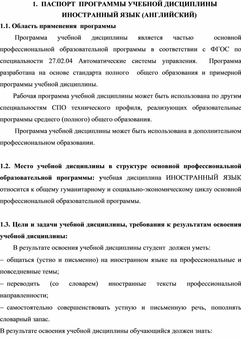 1. ПАСПОРТ ПРОГРАММЫ УЧЕБНОЙ ДИСЦИПЛИНЫ ИНОСТРАННЫЙ ЯЗЫК (АНГЛИЙСКИЙ)