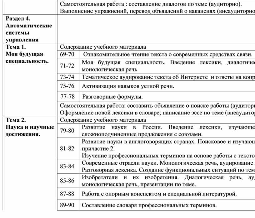 внеаудиторная самостоятельная работа: - оформление словаря делового человека по специальности; - перевод текстов «Образование в России», «Современные средства связи в России»; - практикум по работе с профессионально ориентированным текстом; - подготовка сообщений по теме о роли технического прогресса в нашей жизни; - подготовка презентаций о предприятиях области, о Кольской АЭС, о городе энергетиков Полярные Зори, о роли компьютера в жизни человека; - подготовка письменного перевода главы технического руководства; - разработка учебных проектов на тему: «Наш колледж через 20 лет»; - написание резюме для устройства на работу |