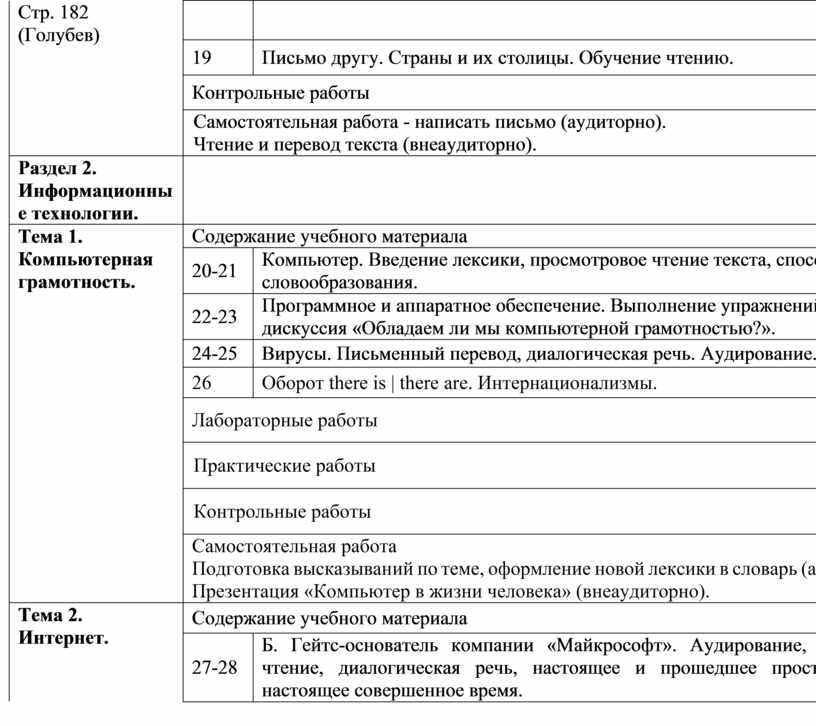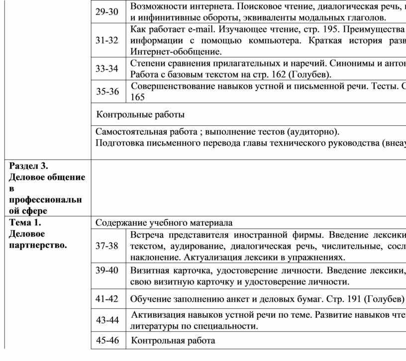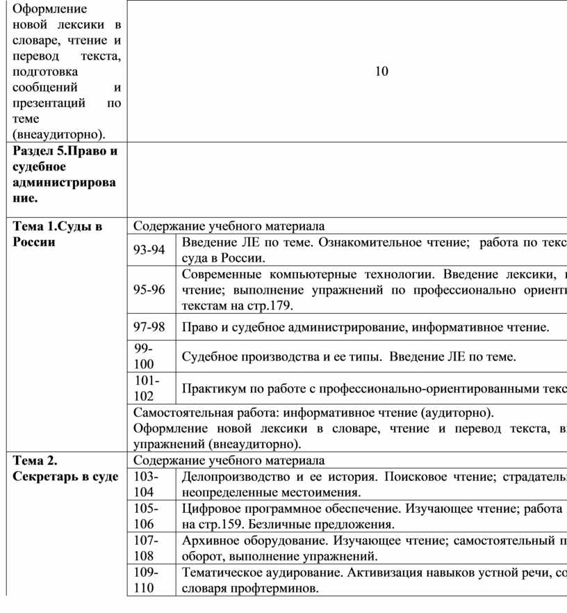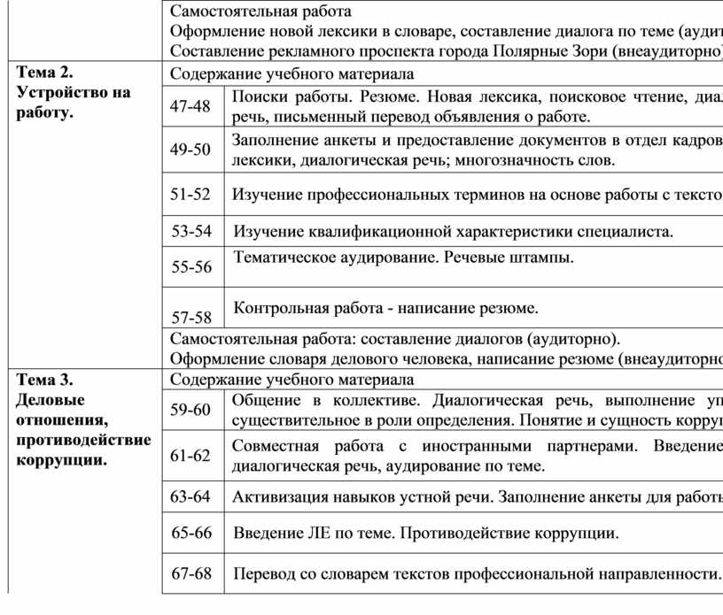 внеаудиторная самостоятельная работа: - оформление словаря делового человека по специальности; - перевод текстов «Образование в России», «Право»; - практикум по работе с профессионально ориентированным текстом; - подготовка сообщений по теме о роли технического прогресса в нашей жизни; - подготовка презентаций о предприятиях области, о Кольской АЭС, о городе энергетиков Полярные Зори, о роли компьютера в жизни человека; - подготовка письменного перевода главы о правовой деятельности; - разработка учебных проектов на тему: «Наш колледж через 20 лет»; - написание резюме для устройства на работу |