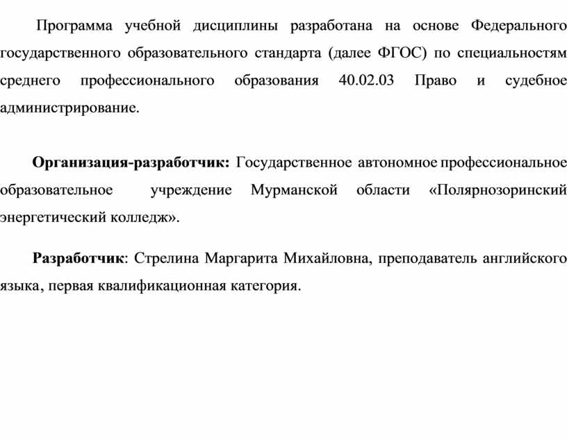 Программа учебной дисциплины разработана на основе Федерального государственного образовательного стандарта (далее ФГОС) по специальностям среднего профессионального образования 40.02.03 Право и судебное администрирование.