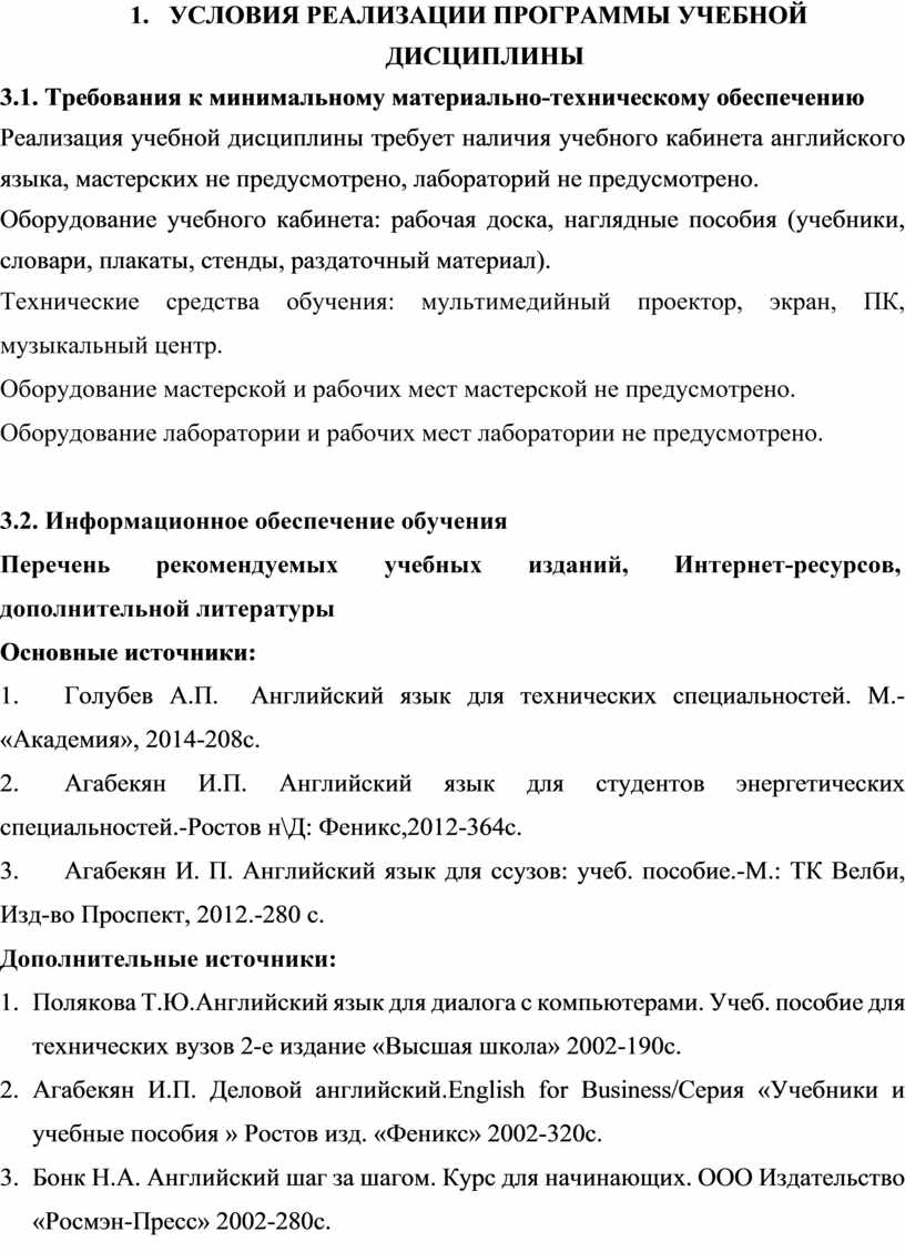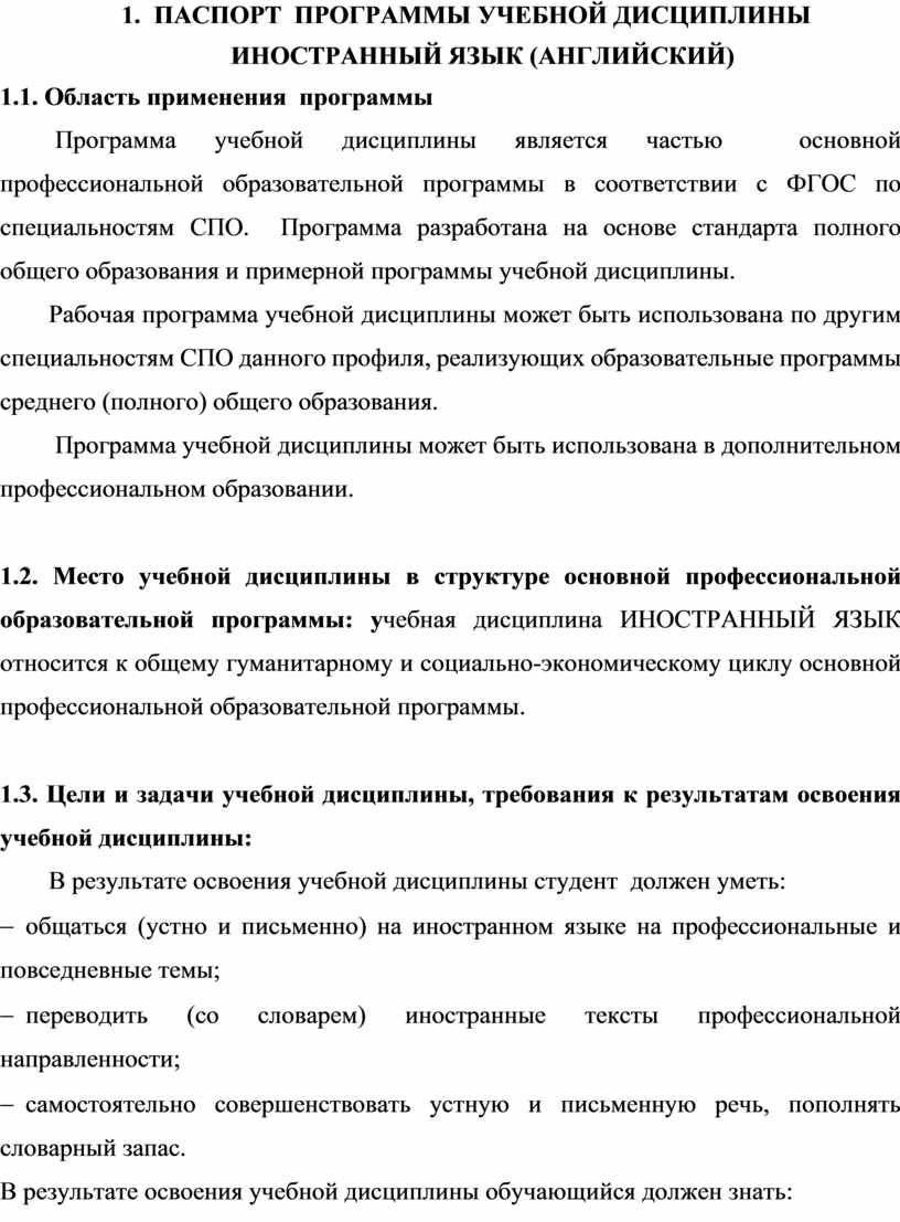 1. ПАСПОРТ ПРОГРАММЫ УЧЕБНОЙ ДИСЦИПЛИНЫ ИНОСТРАННЫЙ ЯЗЫК (АНГЛИЙСКИЙ)