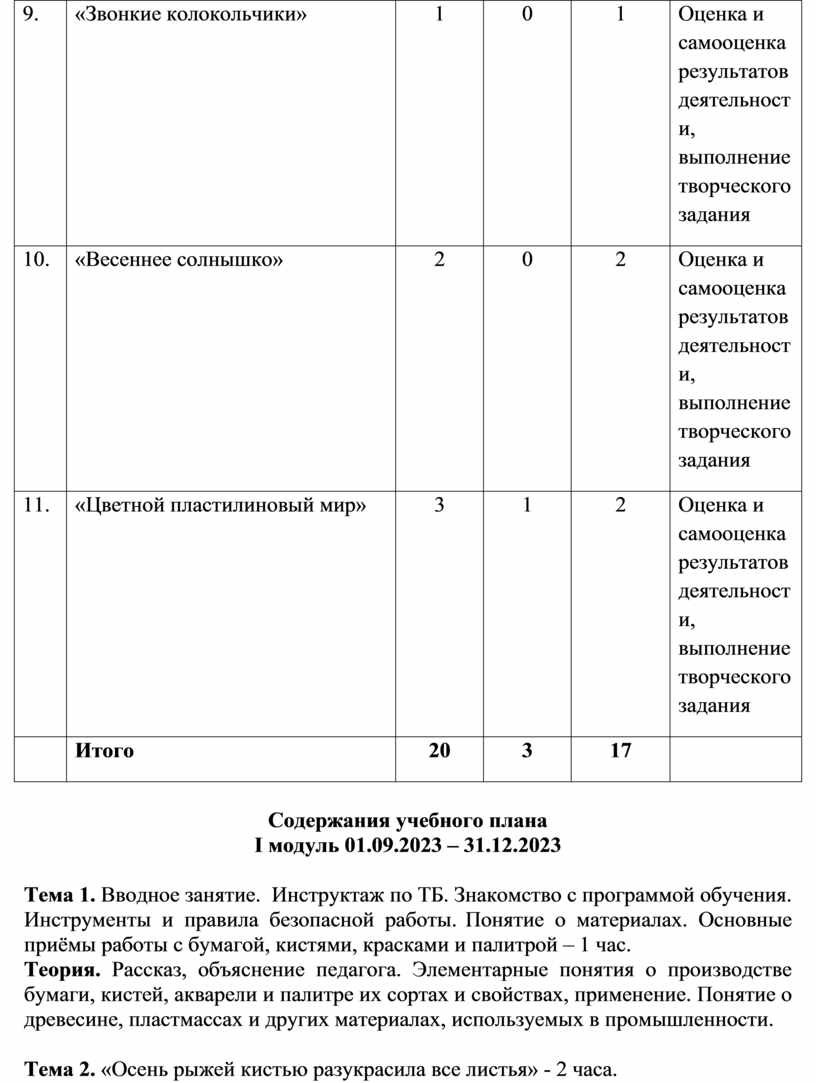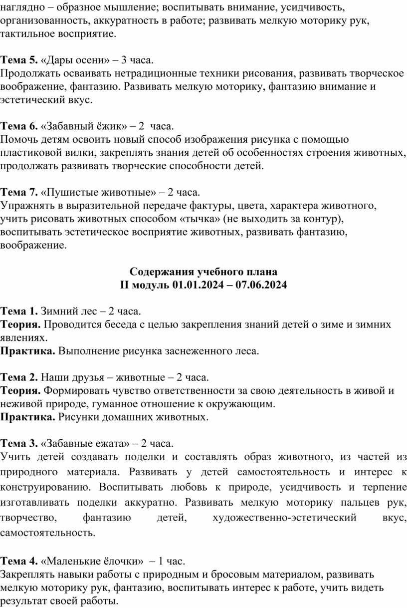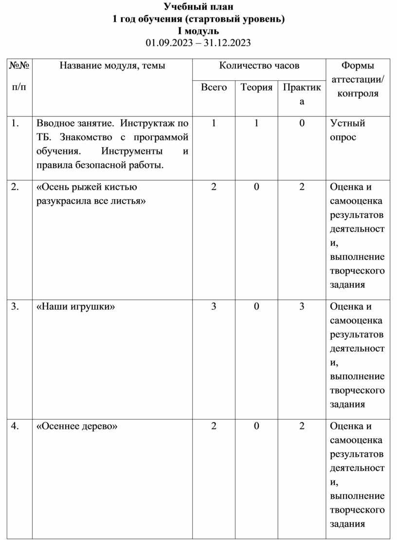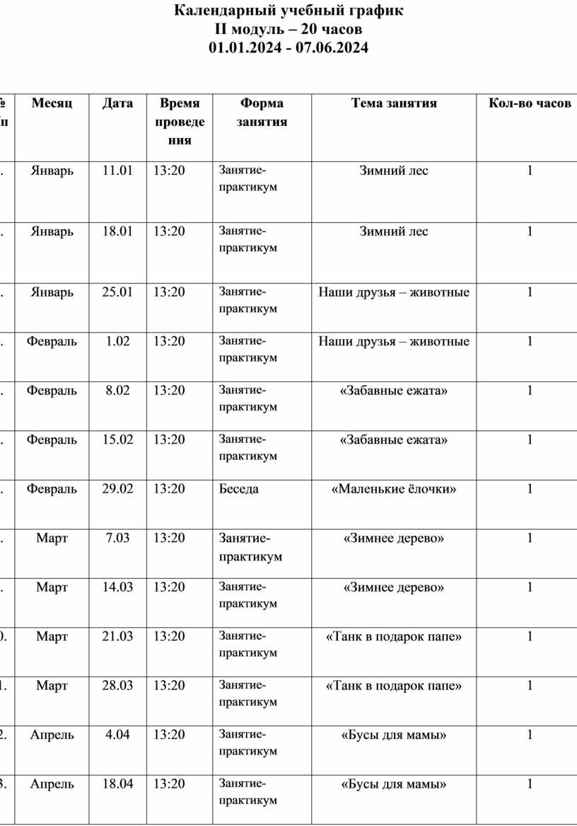 В период обучения занятия проводятся 1 раз в неделю по 35 – 40 минут и включают 2 модуля: 1 модуль – 15 недель (15 часов); 2 модуль 20 недель (20 часов). Всего за год - 35 недель. За весь год обучения - 35 часов.