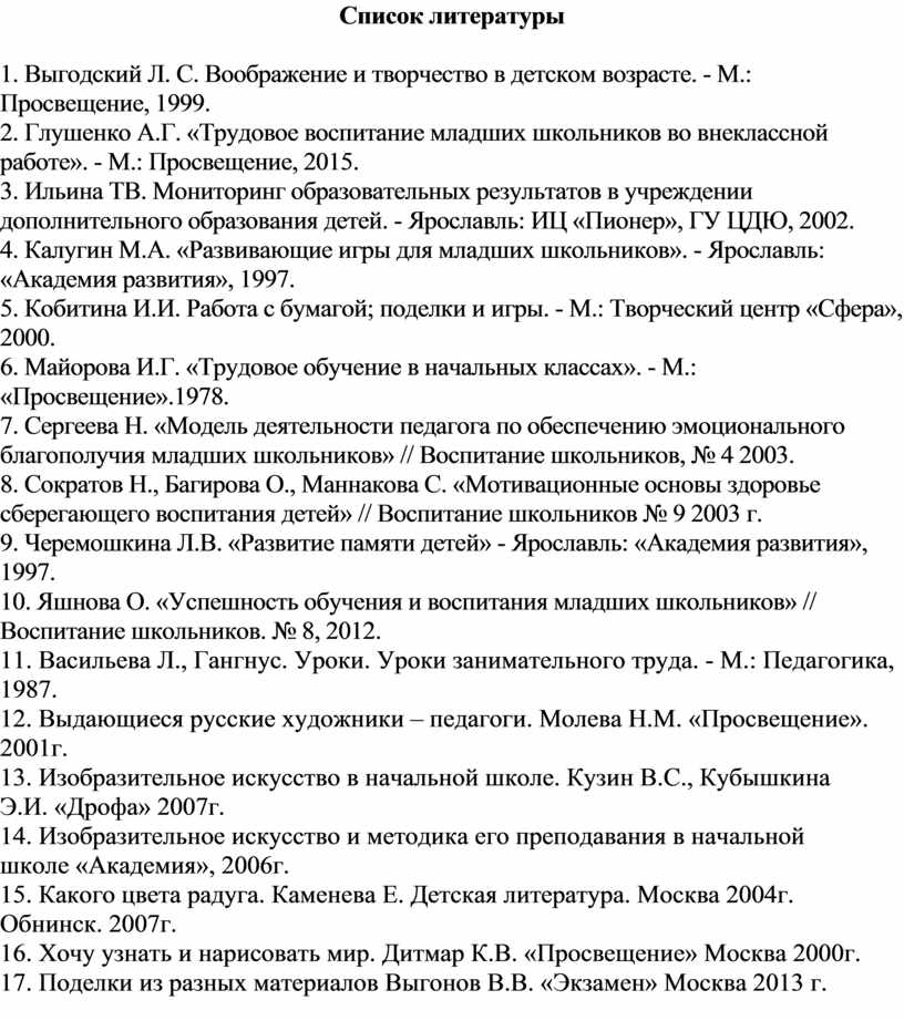 2. Глушенко А.Г. «Трудовое воспитание младших школьников во внеклассной работе». - М.: Просвещение, 2015.