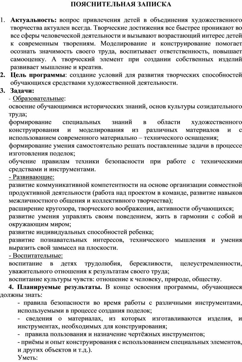 1. Актуальность: вопрос привлечения детей в объединения художественного творчества актуален всегда. Творческие достижения все быстрее проникают во все сферы человеческой деятельности и вызывают возрастающий интерес детей к современным творениям. Моделирование и конструирование помогает осознать значимость своего труда, воспитывает ответственность, повышает самооценку. А творческий элемент при создании собственных изделий развивает мышление и креатив.