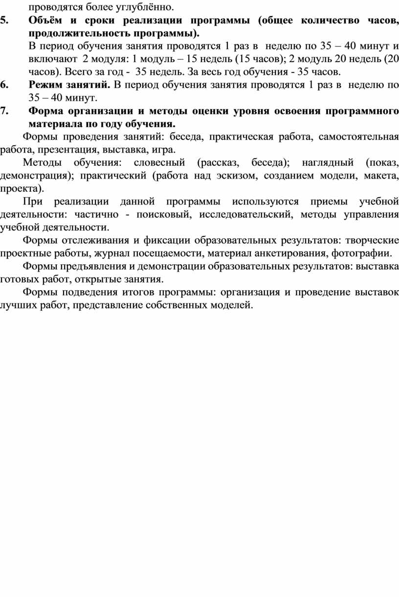 Методы обучения: словесный (рассказ, беседа); наглядный (показ, демонстрация); практический (работа над эскизом, созданием модели, макета, проекта).
