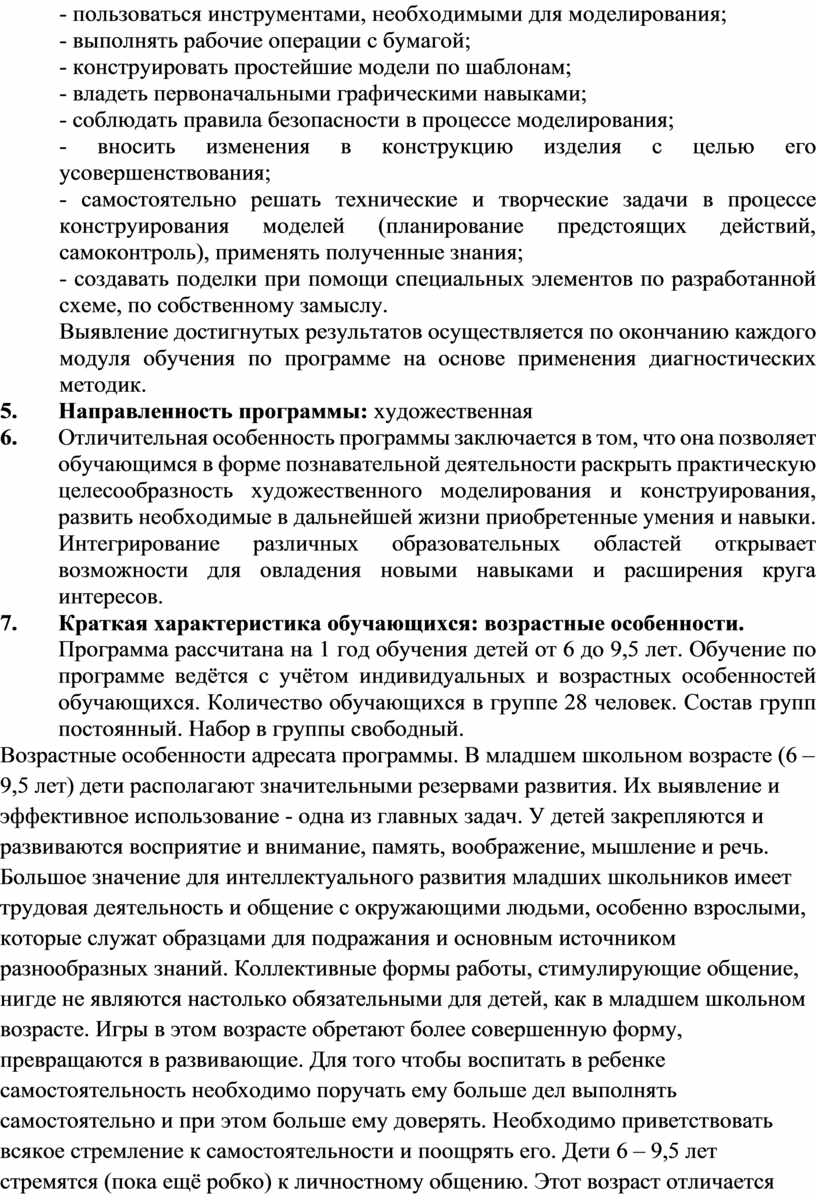 6. Отличительная особенность программы заключается в том, что она позволяет обучающимся в форме познавательной деятельности раскрыть практическую целесообразность художественного моделирования и конструирования, развить необходимые в дальнейшей жизни приобретенные умения и навыки. Интегрирование различных образовательных областей открывает возможности для овладения новыми навыками и расширения круга интересов.