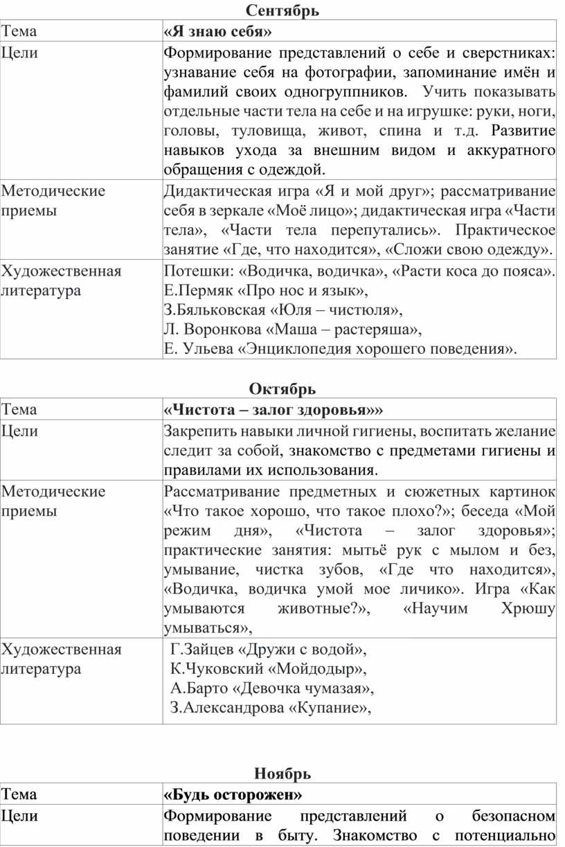 Формирование представлений о себе и сверстниках: узнавание себя на фотографии, запоминание имён и фамилий своих одногруппников. Учить показывать отдельные части тела на себе и на игрушке: руки, ноги, головы, туловища, живот, спина и т.д. Развитие навыков ухода за внешним видом и аккуратного обращения с одеждой. |