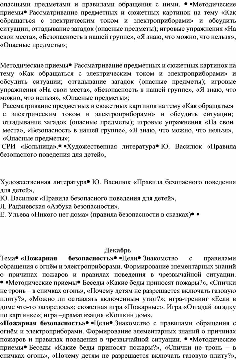 Ю. Василюк «Правила безопасного поведения для детей», Л. Радзиевская «Азбука безопасности». Е. Ульева «Никого нет дома» (правила безопасности в сказках) |