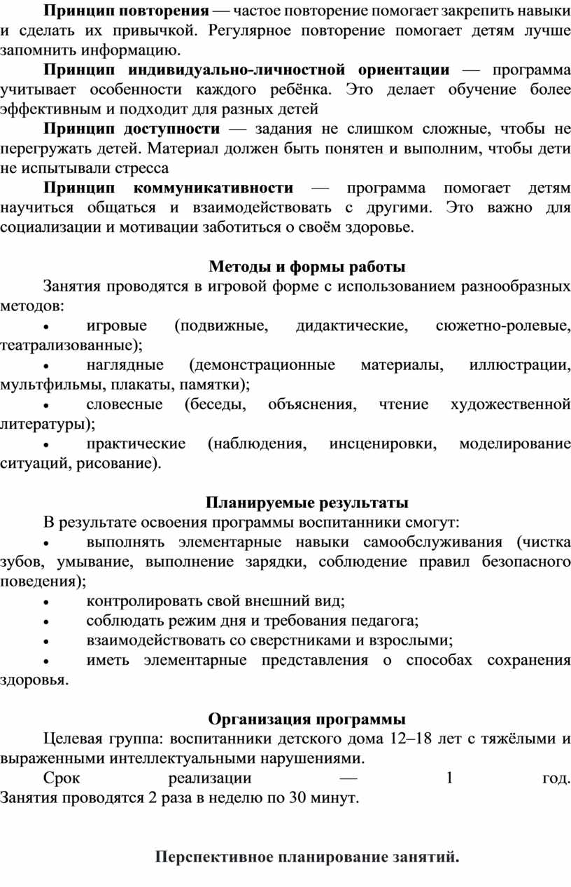 Цель программы: сохранение и укрепление физического, психического и социального здоровья воспитанников с тяжёлыми и выраженными интеллектуальными нарушениями, формирование у них навыков личной гигиены, культуры поведения и основ здорового образа жизни через практическую подготовку ребенка к самостоятельной жизни.