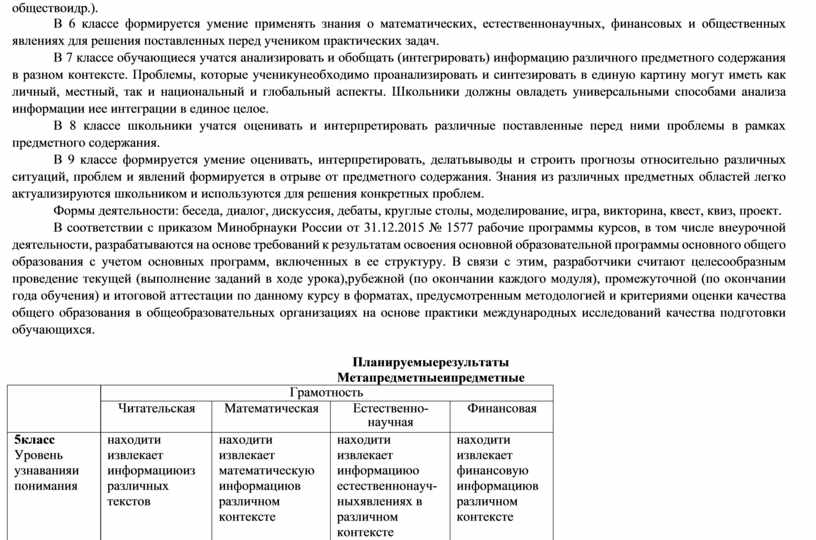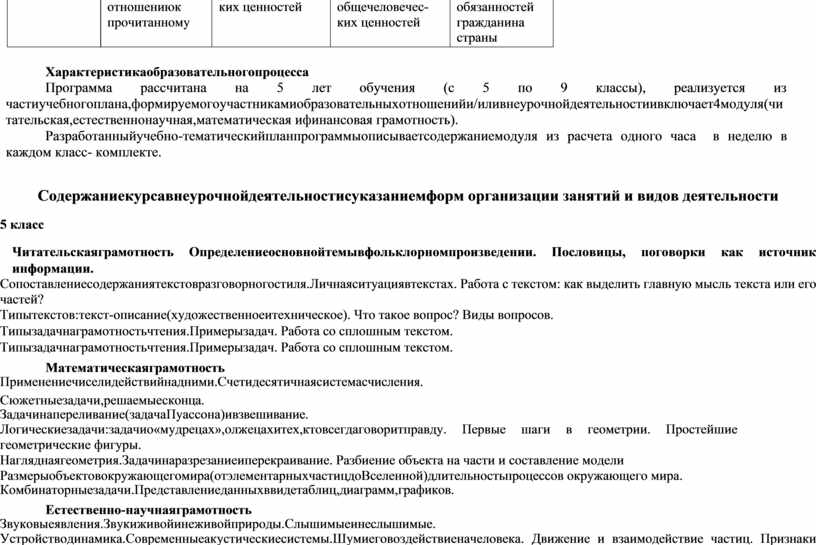 Программа рассчитана на 5 лет обучения (с 5 по 9 классы), реализуется из часов внеурочной деятельности и включает 4 модуля (читательская, естественнонаучная, математическая и финансовая грамотность).