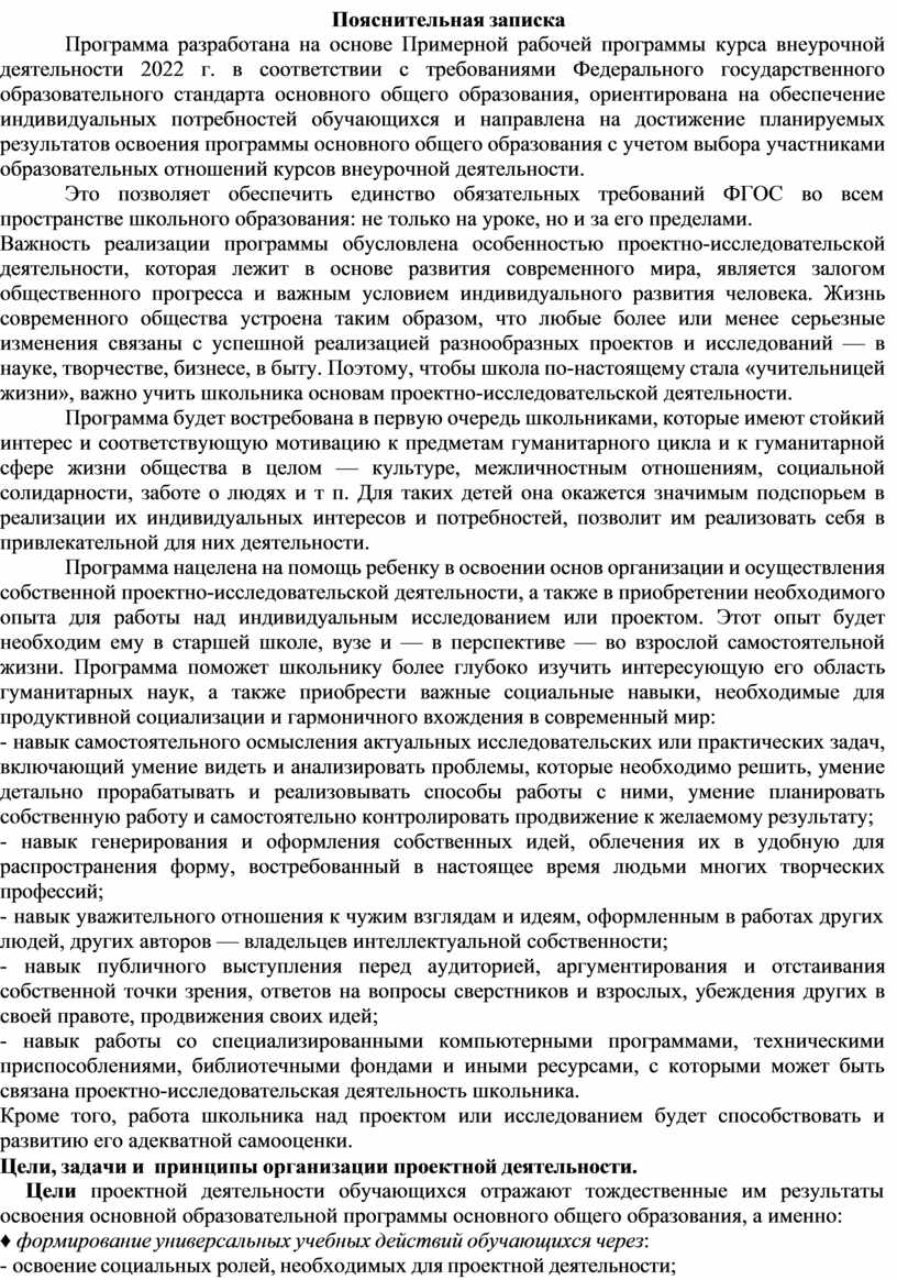 Программа разработана на основе Примерной рабочей программы курса внеурочной деятельности 2022 г. в соответствии с требованиями Федерального государственного образовательного стандарта основного общего образования, ориентирована на обеспечение индивидуальных потребностей обучающихся и направлена на достижение планируемых результатов освоения программы основного общего образования с учетом выбора участниками образовательных отношений курсов внеурочной деятельности.