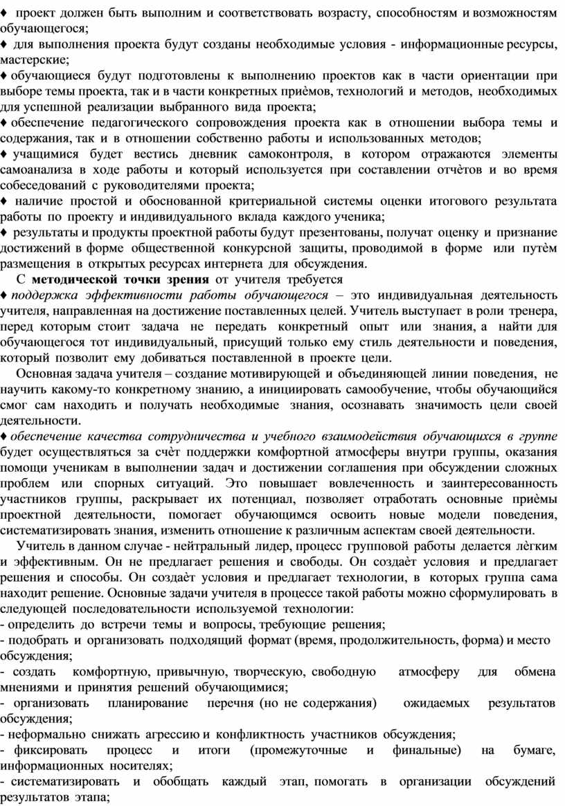 ♦ обеспечение педагогического сопровождения проекта как в отношении выбора темы и содержания, так и в отношении собственно работы и использованных методов;