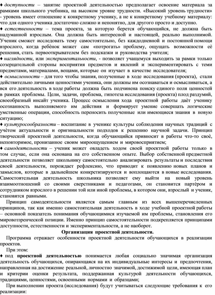 Принцип самодеятельности является самым главным из всех вышеперечисленных принципов, так как именно самостоятельная деятельность в ходе учебной проектной работы – основной показатель понимания обучающимися изучаемой им проблемы, становления его мировоззренческой позиции. Именно принцип самостоятельности подкрепляется принципами доступности, естественности и экспериментальности, а не наоборот.