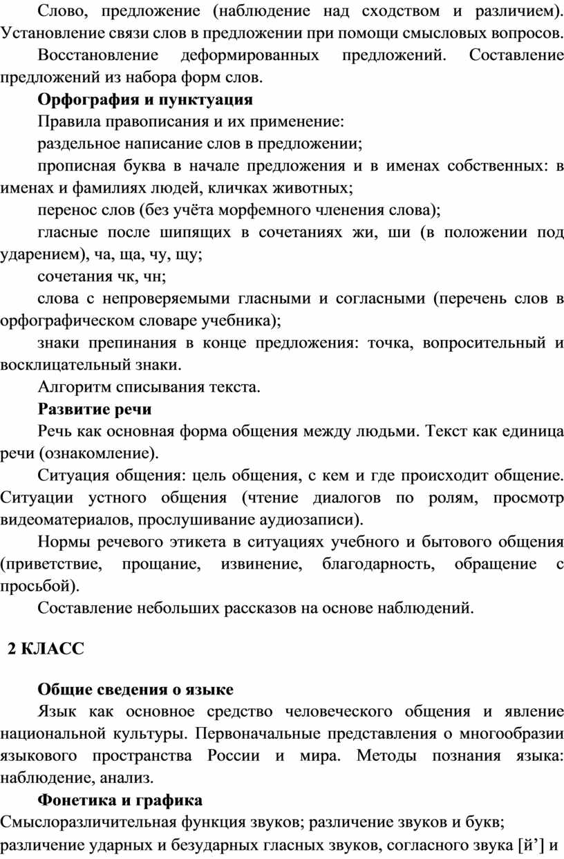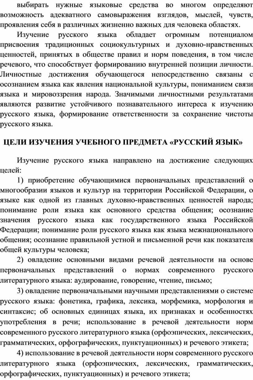 Первичное знакомство с системой русского языка, богатством его выразительных возможностей, развитие умения правильно и эффективно использовать русский язык в различных сферах и ситуациях общения способствуют успешной социализации обучающегося. Русский язык, выполняя свои базовые функции общения и выражения мысли, обеспечивает межличностное и социальное взаимодействие, способствует формированию самосознания и мировоззрения личности, является важнейшим средством хранения и передачи информации, культурных традиций, истории русского народа и других народов России. Свободное владение языком, умение выбирать нужные языковые средства во многом определяют возможность адекватного самовыражения взглядов, мыслей, чувств, проявления себя в различных жизненно важных для человека областях.
